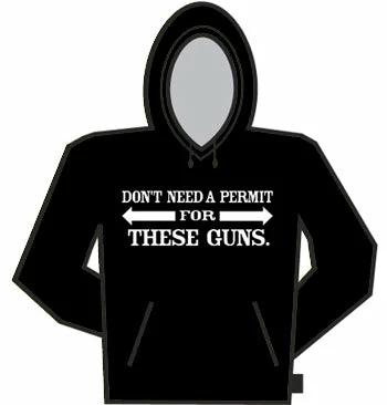 You Don’t Need A Permit For These Guns, You will be able to picture yourself walking anywhere in this Black Hooded 50/50 Sweatshirt. Designed for warmth and durability the 7.5 ounce, 50/50 blend fleece fabric with double-ply hood provides protection from a blinding snow storm at the North Pole or from blowing sand in the Mojave Desert. This hooded sweat is versitility plus. The convenient pouch pocket keeps hands warm or holds a water bottle. The matching drawstring and metal grommets on the hood make sure it stays where it belongs. The set-in sleeves, ribbed cuffs and banded bottom all keep this shirt together in a way that makes durability its middle name.