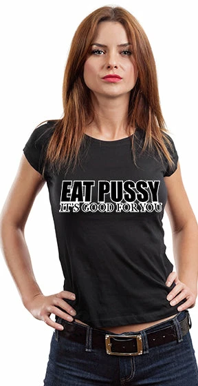 Eat Pus*y Womens Girls T-Shirt. Exclusively from Bewild.com, these new tee’s feature hard-core sayings that say it all. From “Trust Me I’m A Doctor” to “Thats Mr. Asshole To You”. How about a t-shirt that says “I Scored High On My Drug Test” Our short sleeve t-shirts are made from a 100% fully machine washable cotton/poly blend for a cool and comfortable fit every time. On the front of this shirt it says “Eat Pus*y It’s Good For You”.