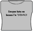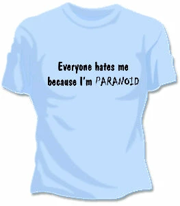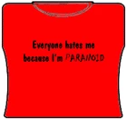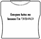 Everyone Hates Me Girls T-Shirt. Exclusively from Bewild.com, these new tee’s feature hard-core sayings that say it all. From “Lick Here For Full View” to “Skanky white-trailer trash”. How about a t-shirt that says “Dip me in Chocolate and throw me to the lesbians?” Our short sleeve “Everyone Hates Me Because I’m Paranoid” t-shirts are made from a 100% fully machine washable cotton/poly blend for a cool and comfortable fit every time.