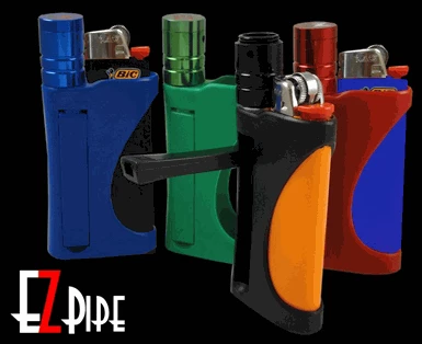 EZ Pipe – EZpipe All in One Smokeless Pocket Pipe Lighter Holder Taking your EZ pipe with you on the go has never been so easy! EZPipe is a small discrete pipe that is ideal for smoking in public; since this pipe is smokeless you do dont have to worry about loose plumes of smoke coming off the pipe. The EZ Pipe’s bowl is fully enclosed so burning herbs stop burning after the toke is complete allowing you to put it right back in your pocket. No embers, ash or residual smoke to worry about. EZ pipe allows you to carry all you need to toke all in one compact unit. The average pipe smoker walks around with a pocket full of paraphernalia. With EZ Pipe all you need in built right in to one self contained pipe. To use EZ Pipe just fill the top storage compartment with loose Legal herb, screw on the lid to keep your shake in place and insert any bic or bic style lighter. Your pipe is now ready to smoke! Carry it with you where ever you go and when you are ready to smoke just extend the mouthpiece, light it up and your smokin’! When you are done taking a hit or two just fold it up and put it back in your pocket. The next time you want to take a toke the pipe is ready to go! This unique pipe is made of plastic and billet aluminum so it is light weight and portable. EZ Pipe virtually eliminates pocket bulge and upon first glance seems to be nothing more then a stylish lighter holder. The EZ Pipe securely fits all standard size bic lighters or similar. You can also smoke EZ Pipe with the cap on or cap off. With the cap on you will minimize smoke loss, conserve your herbs and get a smooth hit; also there is NO RESIDUAL SMOKE! When you smoke with the cap off you will get a heavy rip that is sure to satisfy. Either way this discrete pipe is a great all in one solution for the smoker who is on the go! Bic Lighter Not Included. ALL EZ Pipes now include a cleaning tool!