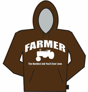 Farmer The Hardest Job, You will be able to picture yourself walking anywhere in this Brown Hooded 50/50 Sweatshirt. Designed for warmth and durability the 7.5 ounce, 50/50 blend fleece fabric with double-ply hood provides protection from a blinding snow storm at the North Pole or from blowing sand in the Mojave Desert. This hooded sweat is versitility plus. The convenient pouch pocket keeps hands warm or holds a water bottle. The matching drawstring and metal grommets on the hood make sure it stays where it belongs. The set-in sleeves, ribbed cuffs and banded bottom all keep this shirt together in a way that makes durability its middle name.
