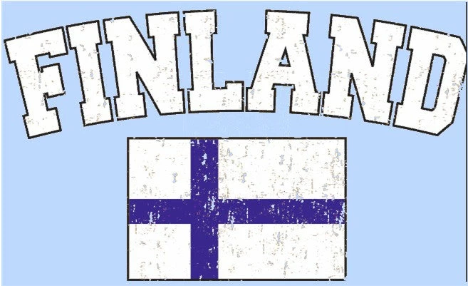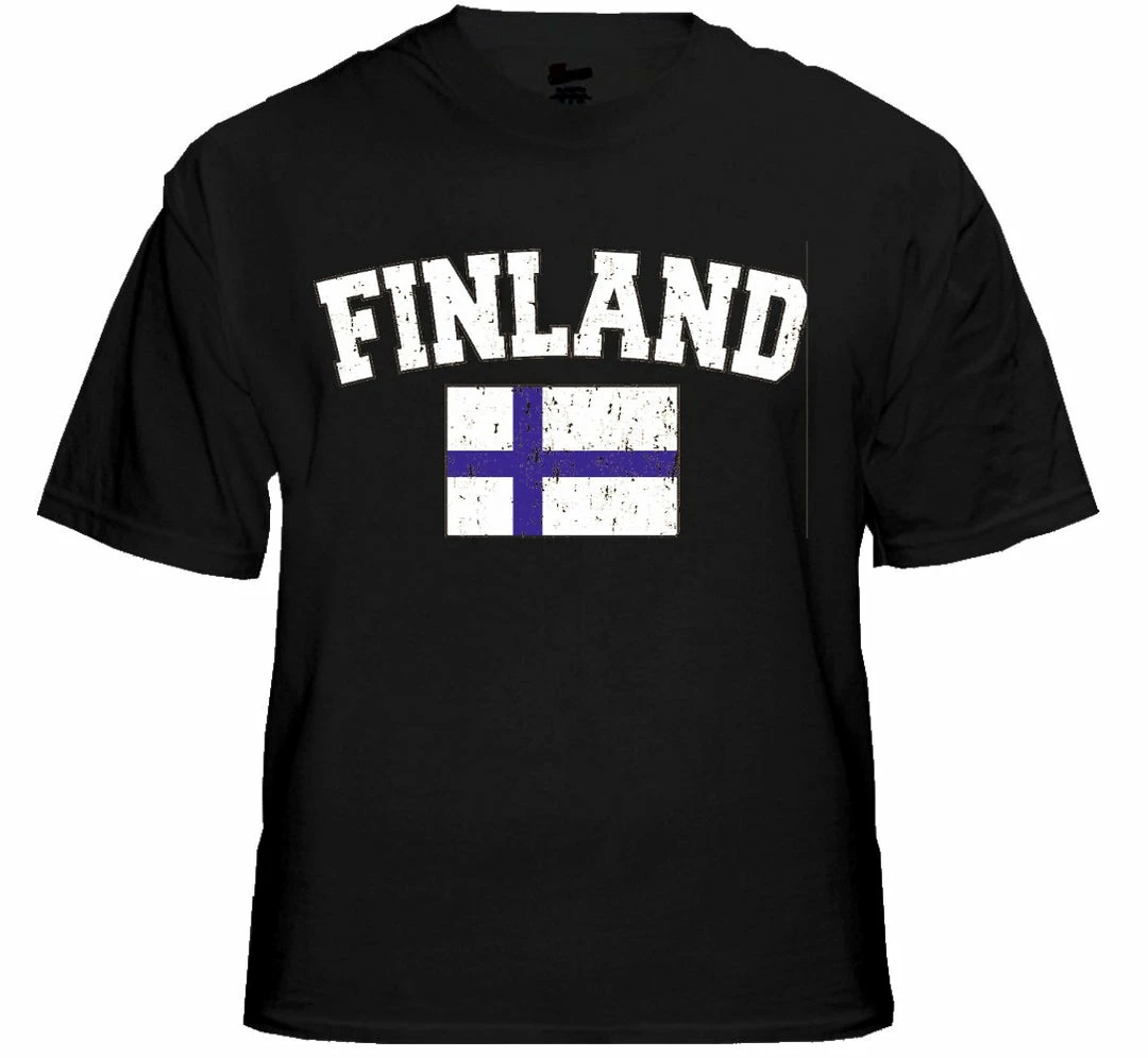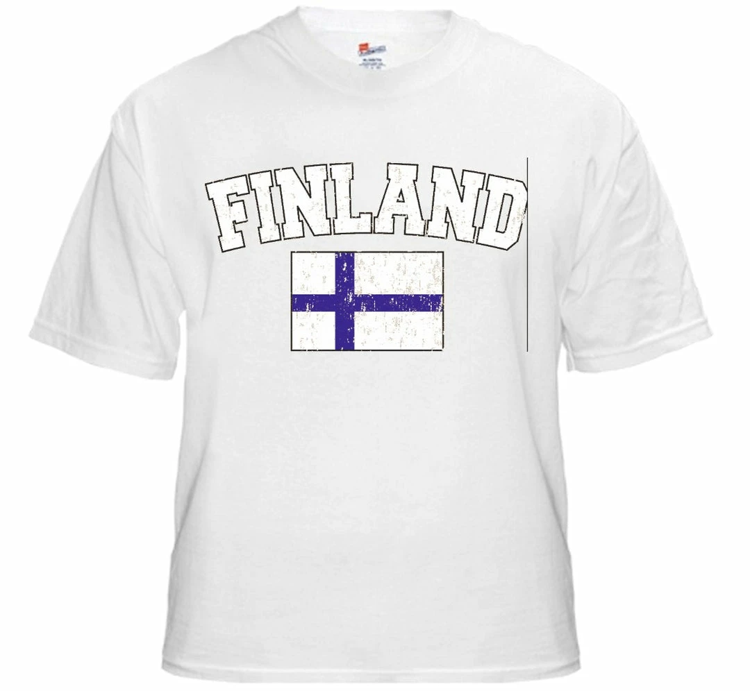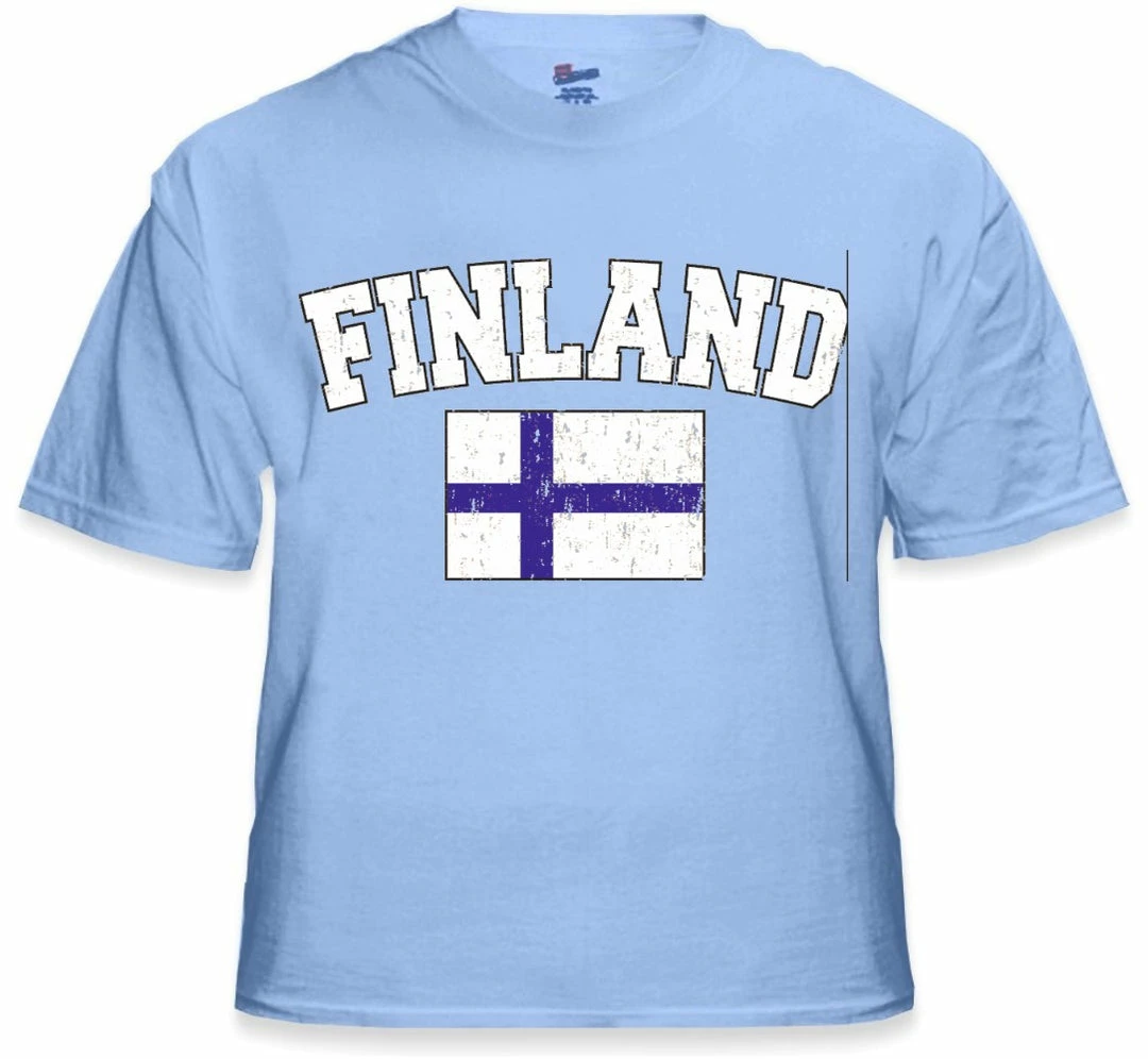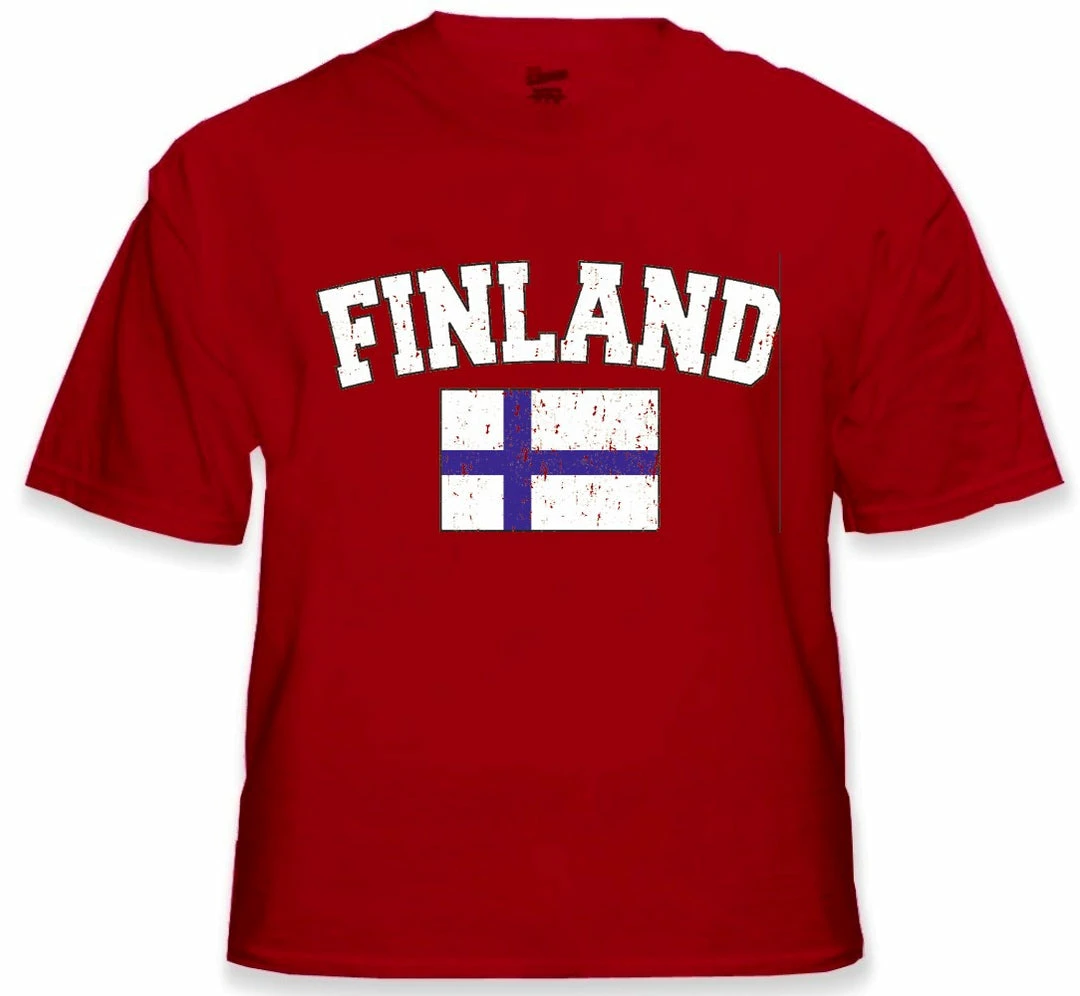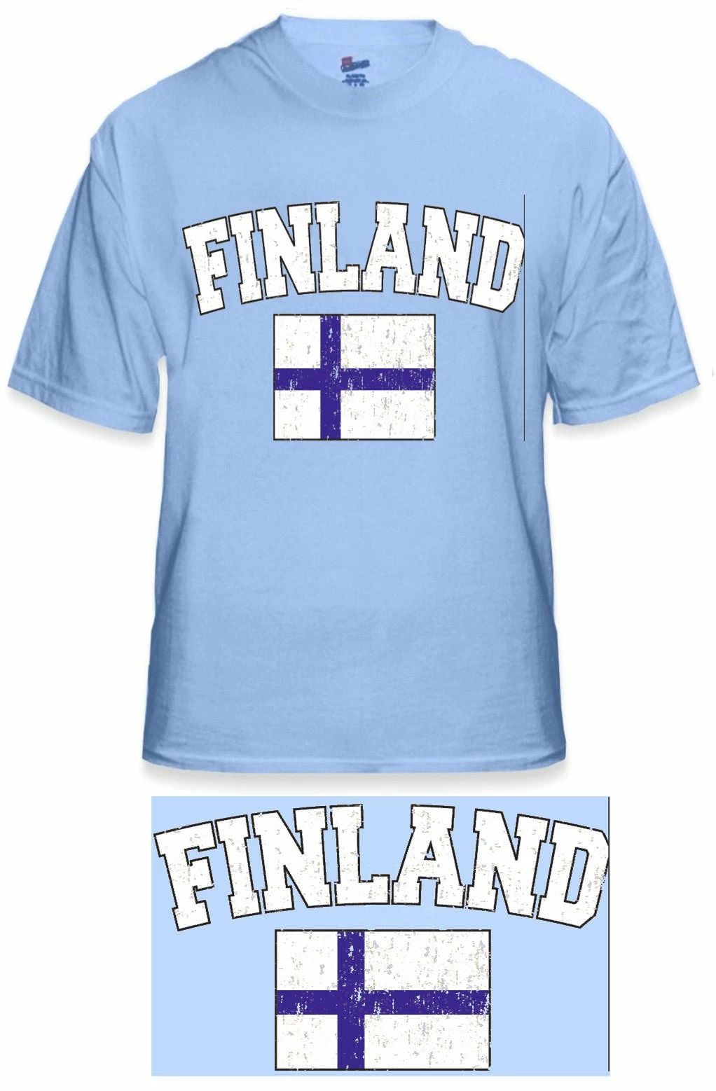Finland Vintage Flag International Mens T-Shirt. Show pride for your favorite Nation! Our collection of deluxe vintage international print t-shirts are the perfect way to support your home country. Each shirt features premium vintage style designs made to look distressed for that soft “Favorite Old T-shirt” look from day one. These shirts are perfect whether you are rooting for your favorite soccer nation or just showing your love for a special country. Bold athletic style writing spells out each country’s name curved above the country’s national shield; a classic design that is sure to display your patriotism! Each shirt is printed to order on a deluxe Cotton tee shirt in your choice of color.