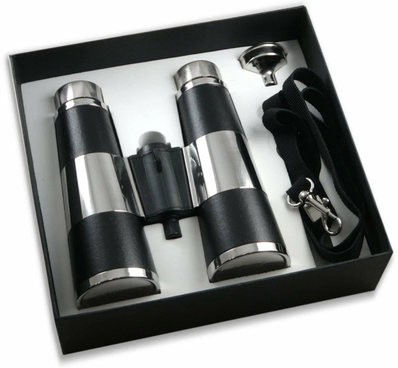 Tired of spending way too much money on cocktails when your at the ball game? When your out on the town drinks can get really pricey! The average mixed drink at a sporting event costs $12; You can make that same drink at home for less then $2. Don’t get ripped off by the high cost of alcohol at concerts or sporting events any more! This double sided binocular flask has been specially designed to fly under the radar of stadium security so you can pour your own drinks once your in. This flask appears to be nothing more then a pair of binoculars when worn around your neck so nobody would ever suspect it is holding liquor! The Binocular flask in constructed of premium grade stainless steel for durability, cleanliness and beauty. This binocular flask is finished in brilliant polished chrome and is accented with black plastic trim so they really appear to be nothing more then a pair of stylish, high end binoculars. This gift set comes complete with everything you need including 1 chrome finished binocular flask; independently double sided so you can hold 6 oz (3 oz in each side) of 2 kinds of alcohol all in one great flask. The gift set also comes complete with a stainless steel funnel to fill the flask and a convenient neck strap so you can wear the flask just like a real pair of binoculars. This Gift set comes complete in a beautifully appointed gift box. Giving this flask as a gift is as easy as order, receive and wrap.