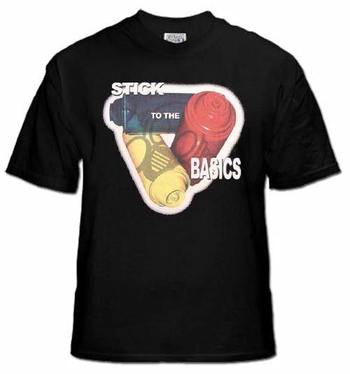 All Ghast t-shirts are made of 100% super soft cotton and completely machine washable. This Ghast t-shirt has a three spray paint cans on the front of the shirt that says “Stick to the Basics!