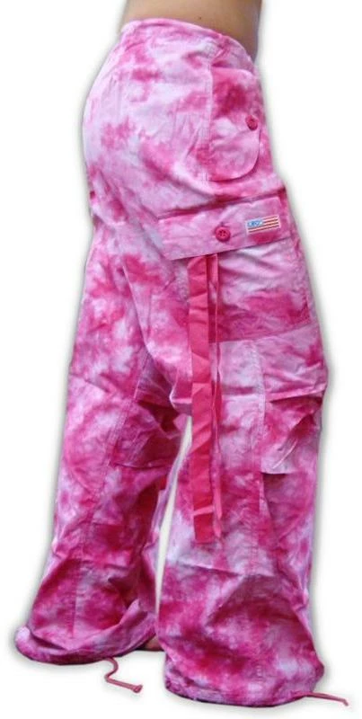 Girls Hipster UFO Pants (Pink Tie Dye). This pair of girly fit UFO pants are are ready to take on an active lifestyle. Whether you are dancing the night away at an underground rave, chillin’ VIP at the hottest night club, working up a sweat at aerobics or going in to competition in a hip hop dance squad these pants have you covered. Our UFO hipster pants have been especially designed for girls on the go; they are cut to hug you perfect in all the right places, feature fully adjustable drawstrings for a custom fit and are made of extremely breathable (not to mention unbelievably comfortable) material that is airy, light weight and unrestricted for maximum mobility! These UFO Girly Hipster pants are made of light weight, incredibly soft 100% Cotton parachute material that is silky smooth to the touch.