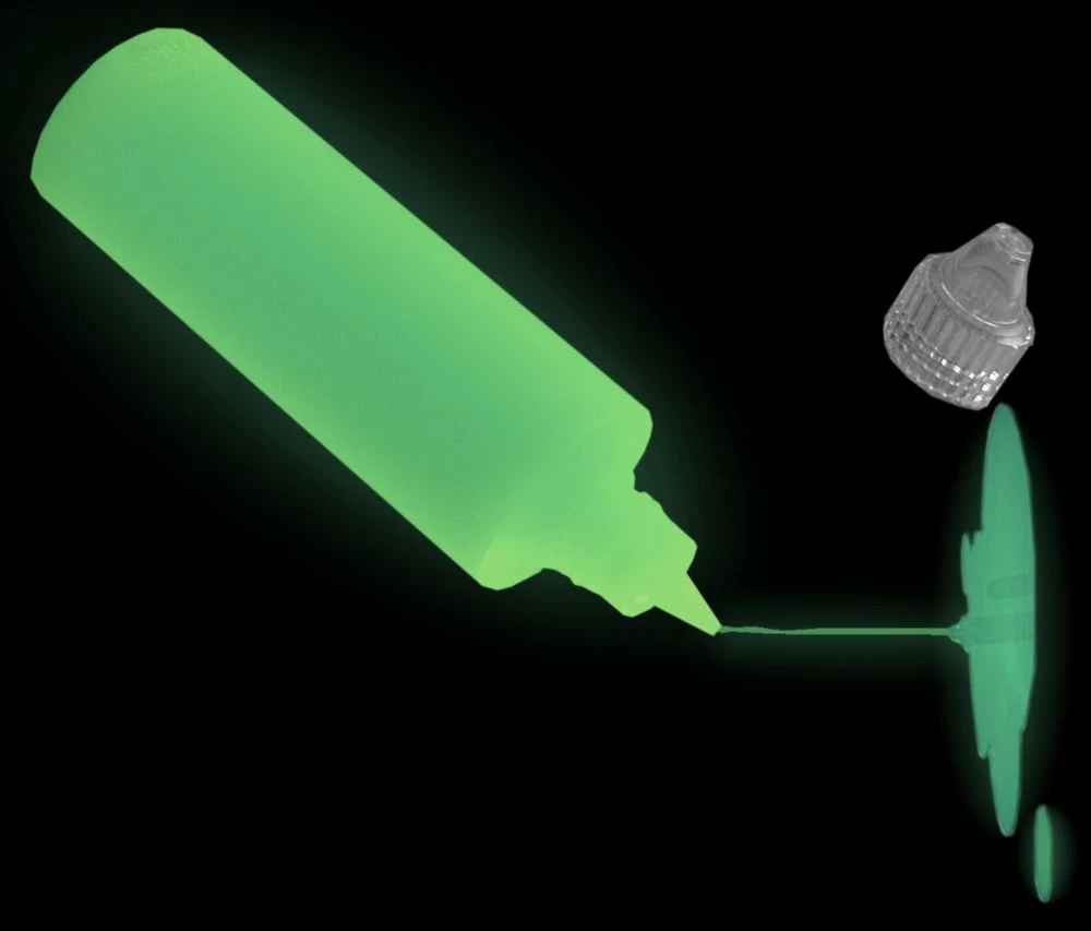 Next Generation SUPER Glow in the Dark Paint. THE MOST EFFECTIVE GLOWING SUBSTANCE ON THE PLANET EARTH! UNLIKE ANY OTHER GLOW PAINT OR MATERIAL YOU HAVE EVER SEEN! Developed by NASA for use on the International Space Station. Newly unclassified Hyper Luminescent Material guaranteed to blow your mind. This substance is not currently availible in any other paint availible to the public. if you are looking for the brightest glowing paint look no further, cuz you’ve found it! This glow paint is made with the exciting NEXT GEN glow powder! This is totally unlike the normal glow-in-the-dark material you are used to. The Next Gen powder glows an incredible 10 times brighter and the glow lasts many, many times longer than regular glow material. A quick 15 minute “charge” (exposure to light) will keep this paint glowing for 24 hours!!! Rechargeable over and over for a lifetime of use. The image to the left is an unedited camera shot of the paint tubes in the dark after just a 1 minute exposure to normal light!