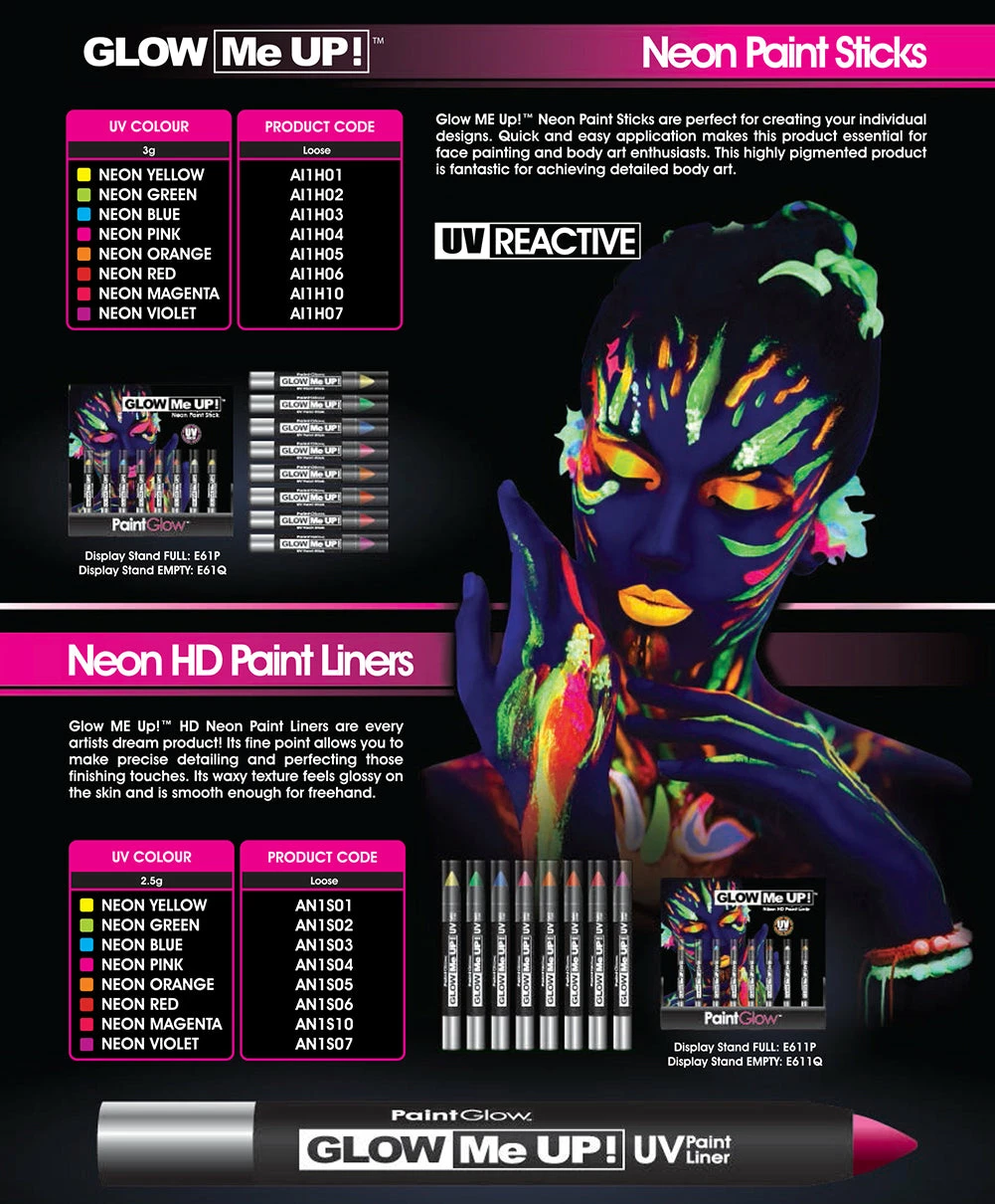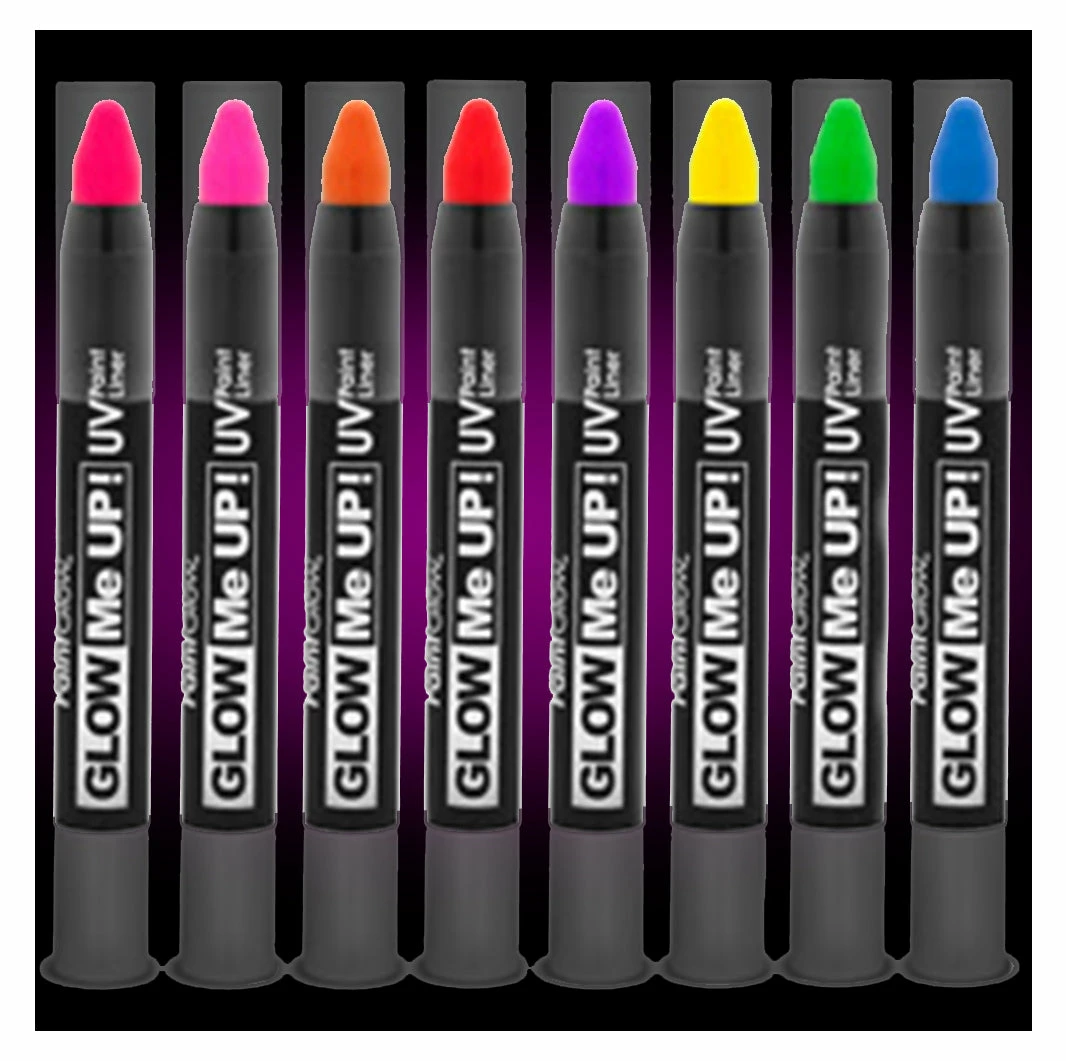 Glow Me Up Neon Paint Liners are every artists dream product! Its fine point allows you to make precise detailing and perfecting those finishing touches. Its waxy texture feel glossy on the skin and is smooth enough for freehand.