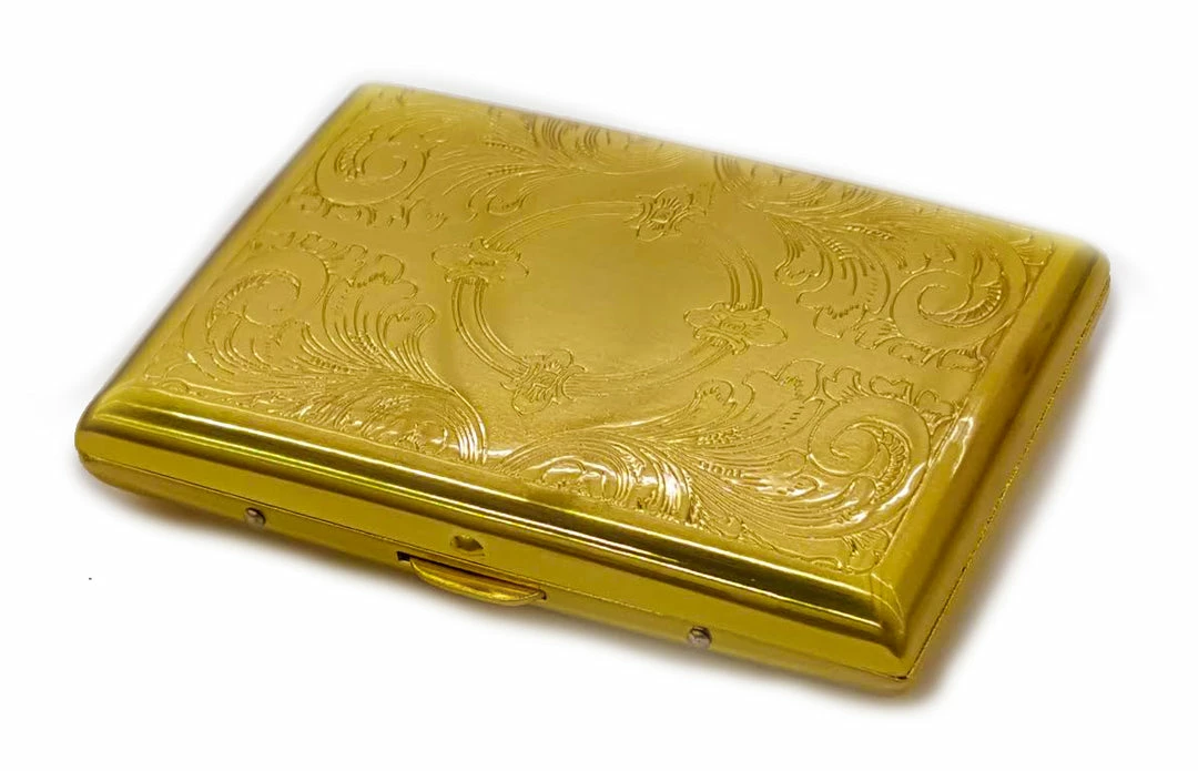 Cigarette Cases are always a classy way to hold on to your cigarettes and prevent them from getting crushed. This elegant case has a space for engraving. Just bring it to any engraver to have engraved. Just flip the spring loaded lid open and retrieve your favorite cigarette. Our Gold Etched Cigarette Case can hold up to 14 regular king sizecigarettes and your ready to go! OVERALL Fits king size only. MEASUREMENT: 2 3/4″ x 3 1/2″.