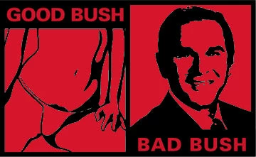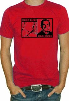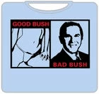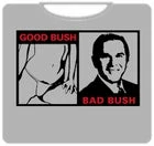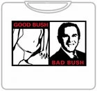 Good Bush Bad Bush T-Shirt. Exclusively from Bewild.com, these new tee’s feature hard-core sayings that say it all. From “Trust Me I’m A Doctor” to “Thats Mr. Asshole To You”. How about a t-shirt that says “I Scored High On My Drug Test” Our short sleeve t-shirts are made from a 100% fully machine washable cotton/poly blend for a cool and comfortable fit every time. On the front of this shirt it says “Good Bush Bad Bush” with a womens waist and a picture of the president.