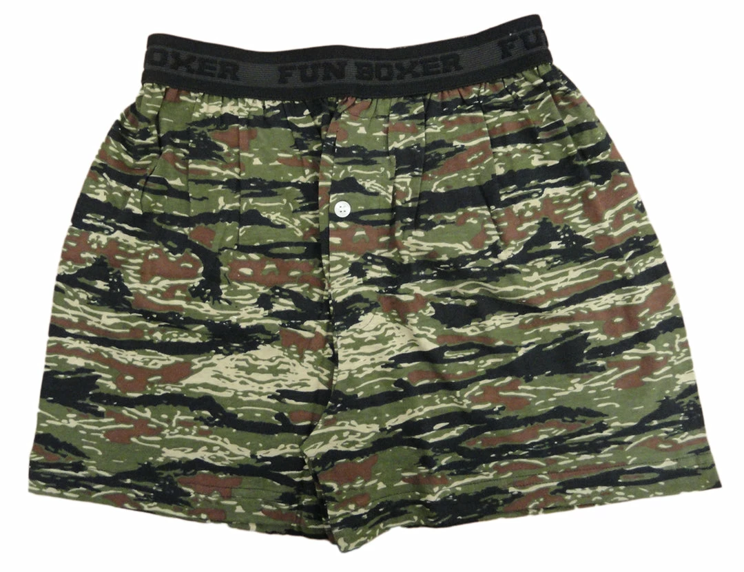 Green Woodland Camo Boxer Shorts. Add a little shock factor to your underwear! These Awesome novelty boxer shorts are sure to turn heads and get a giggle out of who ever sees them. each pair of our novelty boxers are made out off 100% soft cotton for a cool, comfortable feel all day. The sturdy flex fit style waist band features fuzzy smooth inner lining to your underwear fit great and feel even better! These boxer shorts feature a front button fly for easy access. Each pair of these boxer shorts feature premium quality prints in vivid, eye catching colors. This pair of boxers features a bold camouflage print. Be “Unseen” in the boxers!