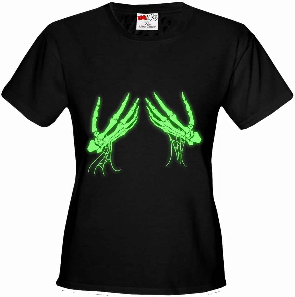 This Halloween Tshirt features Glowing Groping Skeleton Hands. This Halloween T-shirt has a classic, comfortable fit. Oour Halloween shirts are pre-shrunk, so you can expect little to no shrinkage. Available in a Womens Box-cut style, or a Juniors fitted shirt that is contoured at the waist.
