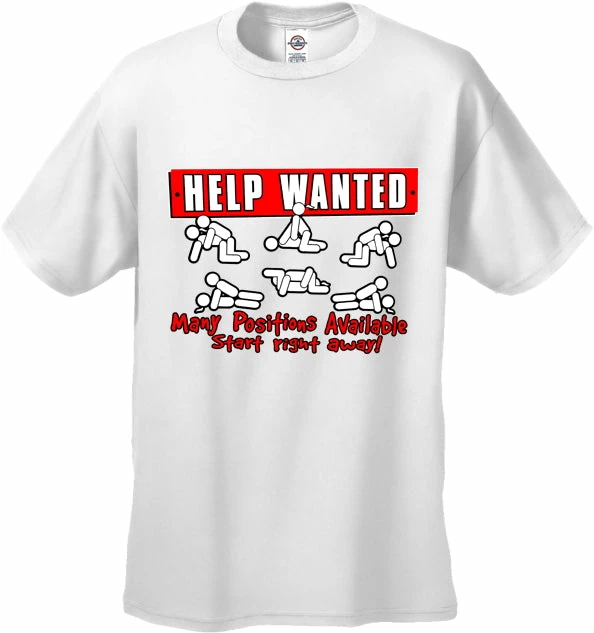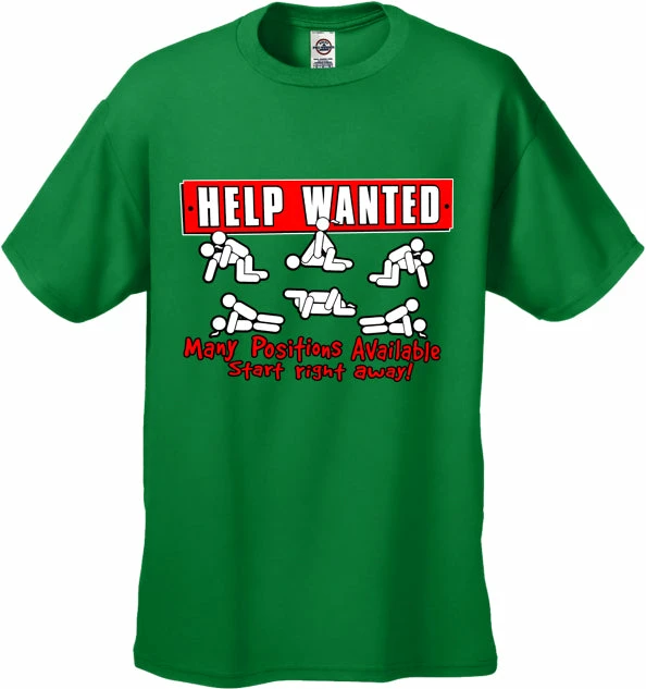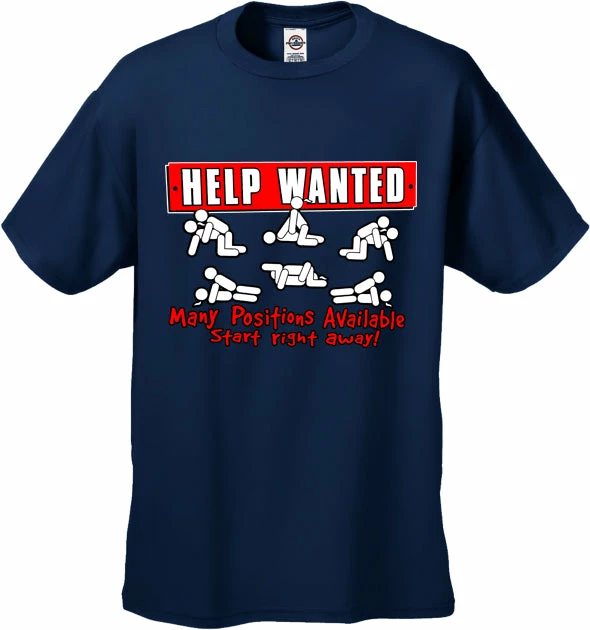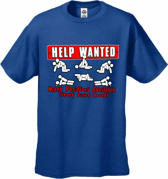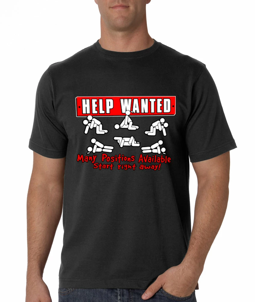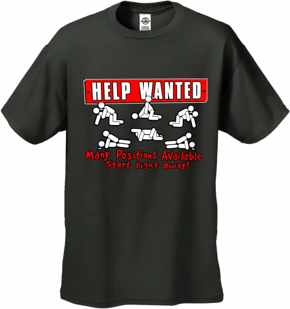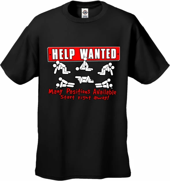 Help Wanted Many Positions Available Mens T-Shirt. Exclusively from Bewild.com, these new tee’s feature hard-core sayings that say it all. From “Trust Me I’m A Doctor” to “Thats Mr. Asshole To You”. How about a t-shirt that says “I Scored High On My Drug Test” Our short sleeve t-shirts are made from a 100% fully machine washable cotton/poly blend for a cool and comfortable fit every time. On the front of this shirt it says “Help Wanted, Many Positions Available, Start Right Away”