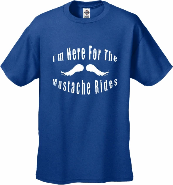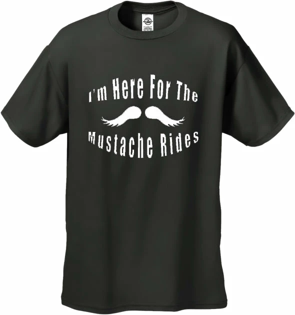 Here For Mustache Rides T-Shirt. Exclusively from Bewild.com, these new tee’s feature hard-core sayings that say it all. From “Trust Me I’m A Doctor” to “Thats Mr. Asshole To You”. How about a t-shirt that says “I Scored High On My Drug Test” Our short sleeve t-shirts are made from a 100% fully machine washable cotton/poly blend for a cool and comfortable fit every time. On the front of this shirt it says “Here For Mustache Rides”.