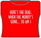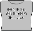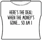 Here’s The Deal Girls T-Shirt. Exclusively from Bewild.com, these new tee’s feature hard-core sayings that say it all. From “Lick Here For Full View” to “Skanky white-trailer trash”. How about a t-shirt that says “Dip me in Chocolate and throw me to the lesbians?” Our short sleeve “Here’ sThe Deal When The Moneys Gone So Am I” t-shirts are made from a 100% fully machine washable cotton/poly blend for a cool and comfortable fit every time.