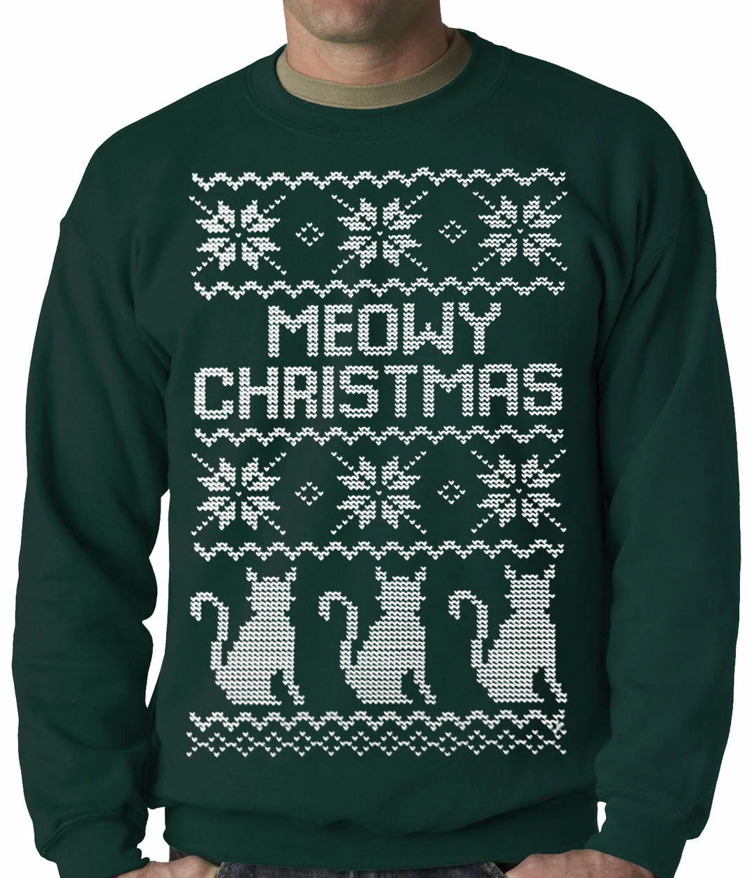 Bewild Holiday Prints Ugly Christmas Sweater – Meowy Christmas (White Print) 3 Cats Ugly Christmas Adult Crewneck