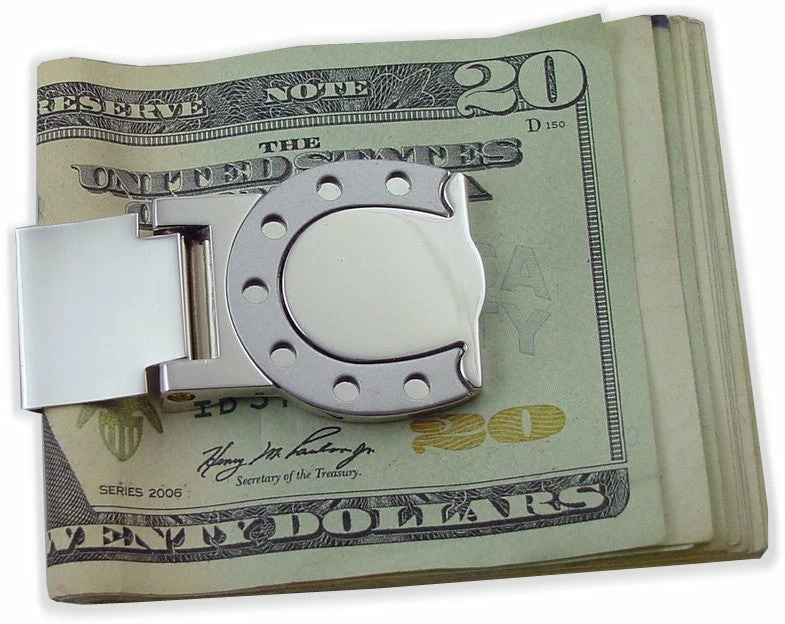 Horse Shoe Hinged Money Clip. Money Clips are the best way to hold your money tight together and in style. Keep your money organized and crisp, while its safely and comfortably tucked away in your pocket. This money clip will hold any amount of money from a few loose bills to a large wad of thousands of dollars. Our Money Clips are constructed of the finest materials, and are sent to you in a special gift box. This money clip makes the perfect gift for the person who has everything. treat yourself today to the smart and elegant way to secure your money.
