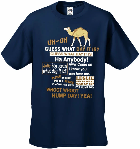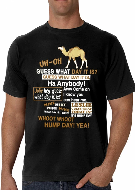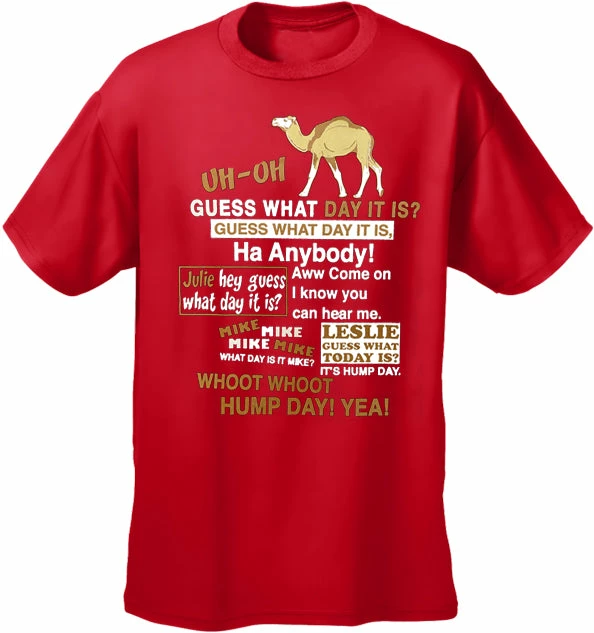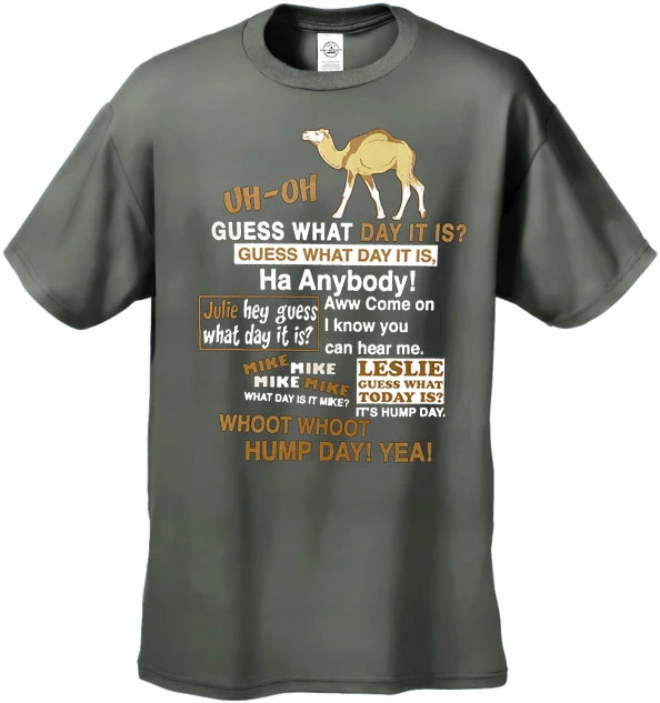 Uh No guess what day it is? Its Hump daaay! Hump Day Camel T-Shirts are available at bewild. All Camels love hump day, and so do most American workers. Chances are you’ve seen the Geico insurance commercial starring a camel … Well now get over the HUMP!!