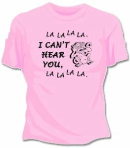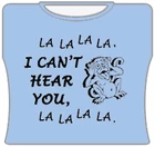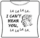 I Can’t Here You Girls T-Shirt. Exclusively from Bewild.com, these new tee’s feature hard-core sayings that say it all. From “Trust Me I’m A Doctor” to “Thats Mr. Asshole To You”. How about a t-shirt that says “I Scored High On My Drug Test” Our short sleeve t-shirts are made from a 100% fully machine washable cotton/poly blend for a cool and comfortable fit every time. On the front of this shirt it says “La La La I Can’t Here You”.