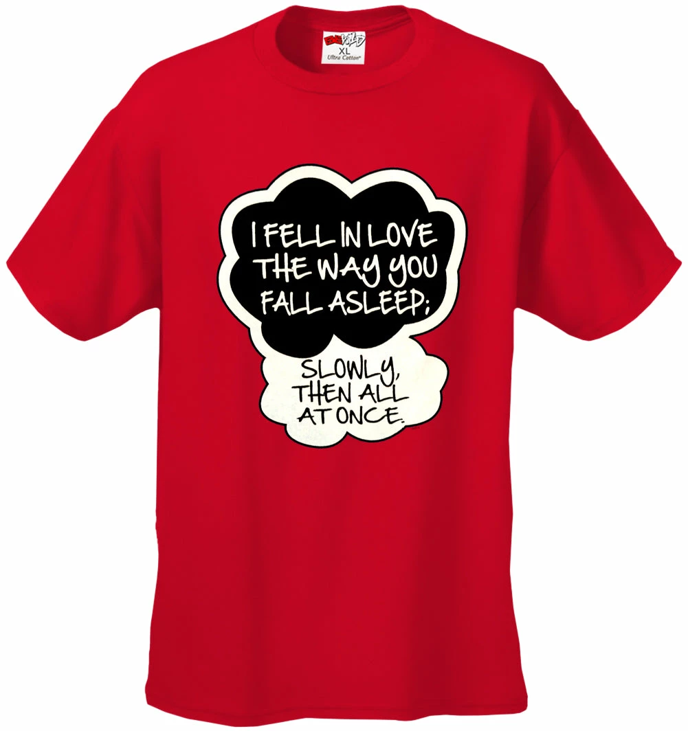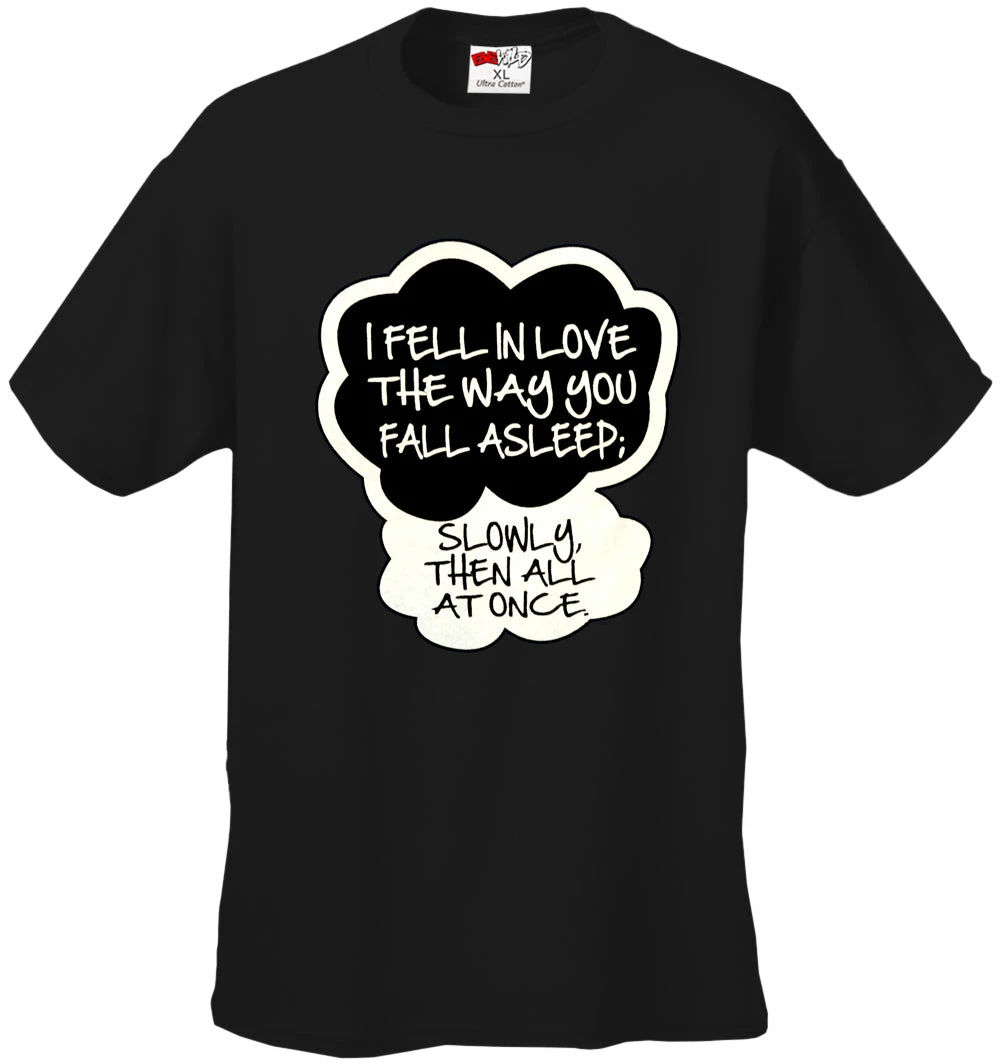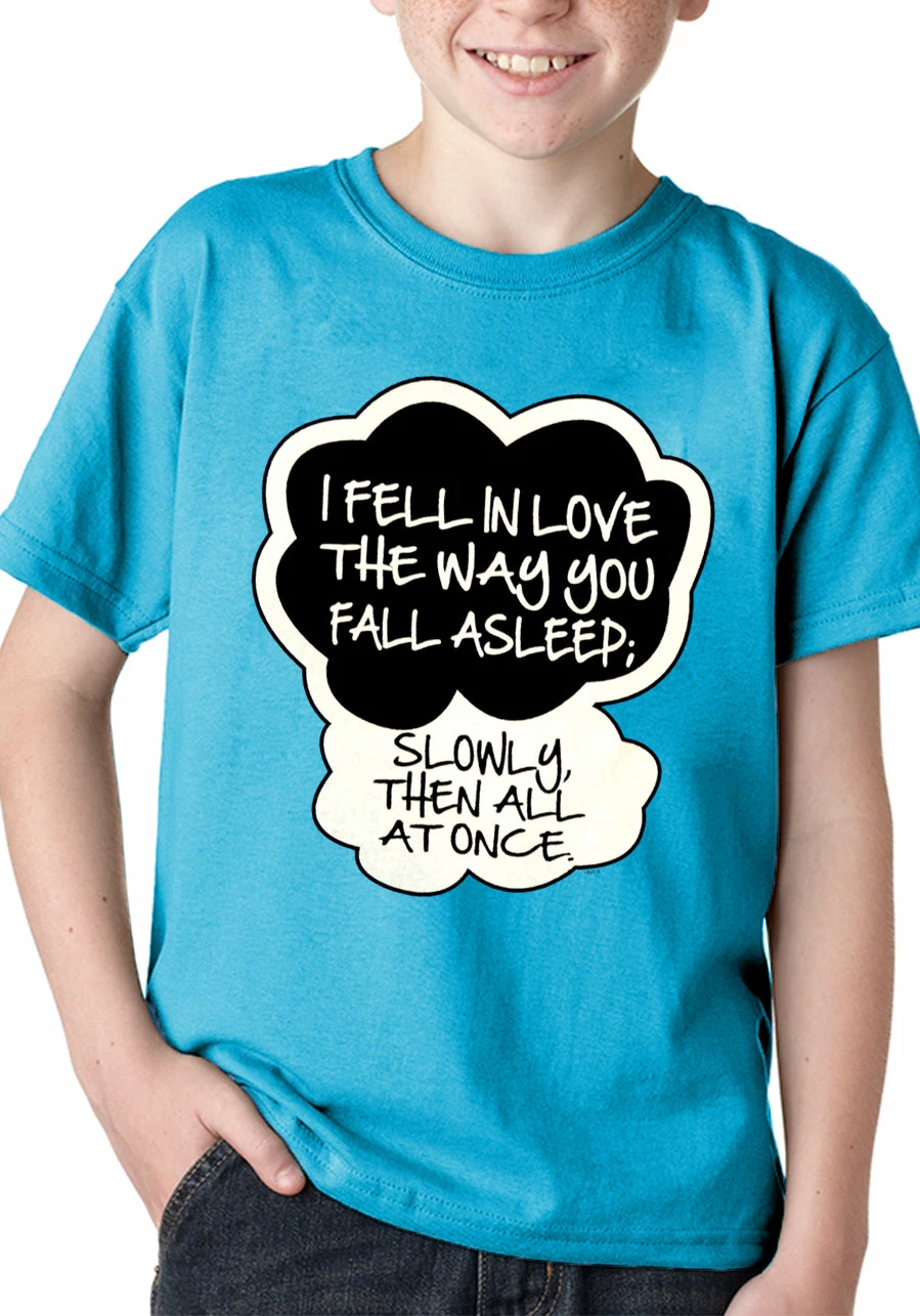 “I Fell In Love” John Green Quote from The Fault in Our Stars Kid’s T-Shirt features a classic 100% Cotton style is a great choice for anyone’s T-shirt drawer. These “I Fell In Love” John Green Quote from The Fault in Our Stars Kid’s T-Shirts have been printed with image on the front. These t shirts are made from heavyweight 6oz. 100% Preshrunk cotton. Looks Great, Priced right – and gets better with each washing.