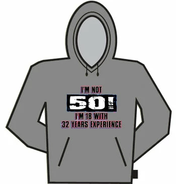 I’m Not 50, I’m 18 With 32 Year Experience!, You will be able to picture yourself walking anywhere in this Grey Hooded 50/50 Sweatshirt. Designed for warmth and durability the 7.5 ounce, 50/50 blend fleece fabric with double-ply hood provides protection from a blinding snow storm at the North Pole or from blowing sand in the Mojave Desert. This hooded sweat is versitility plus. The convenient pouch pocket keeps hands warm or holds a water bottle. The matching drawstring and metal grommets on the hood make sure it stays where it belongs. The set-in sleeves, ribbed cuffs and banded bottom all keep this shirt together in a way that makes durability its middle name.