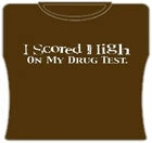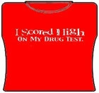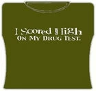 I Scored High, Drug Test Girls T-Shirt. Exclusively from Bewild.com, these new tee’s feature hard-core sayings that say it all. From “Trust Me I’m A Doctor” to “Thats Mr. Asshole To You”. How about a t-shirt that says “I Scored High On My Drug Test” Our short sleeve t-shirts are made from a 100% fully machine washable cotton/poly blend for a cool and comfortable fit every time. On the front of this shirt it says “I scored high on my drug test”.