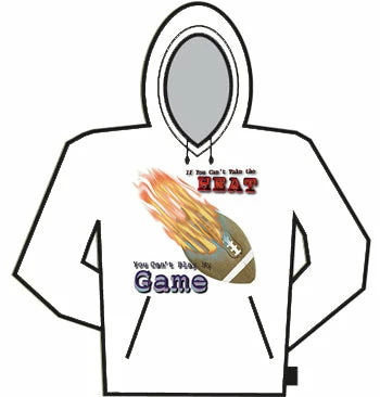 If You Can’t Take The Heat (Football), You will be able to picture yourself walking anywhere in this White Hooded 50/50 Sweatshirt. Designed for warmth and durability the 7.5 ounce, 50/50 blend fleece fabric with double-ply hood provides protection from a blinding snow storm at the North Pole or from blowing sand in the Mojave Desert. This hooded sweat is versitility plus. The convenient pouch pocket keeps hands warm or holds a water bottle. The matching drawstring and metal grommets on the hood make sure it stays where it belongs. The set-in sleeves, ribbed cuffs and banded bottom all keep this shirt together in a way that makes durability its middle name.