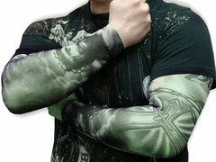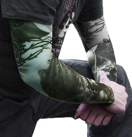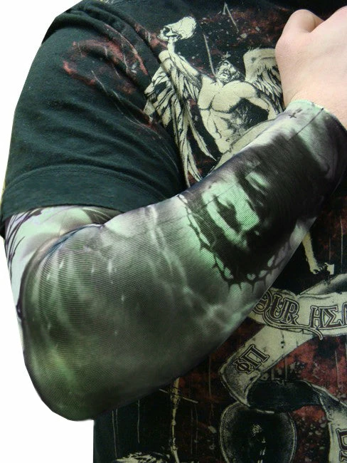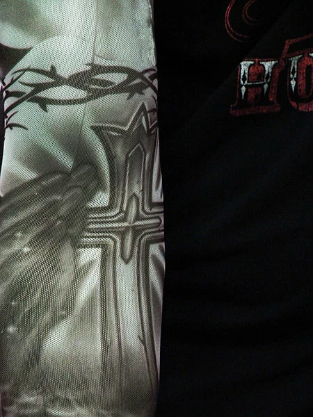 Introducing the NEW Tattoo Sleeve fashion accessory! Anyone that wants the cool tattooed look without the commitment (and pain) of getting a permanent tattoo will love these! This design features a pair of shaded preying hands, the head of Christ, a thorn armband and a reserected cross.