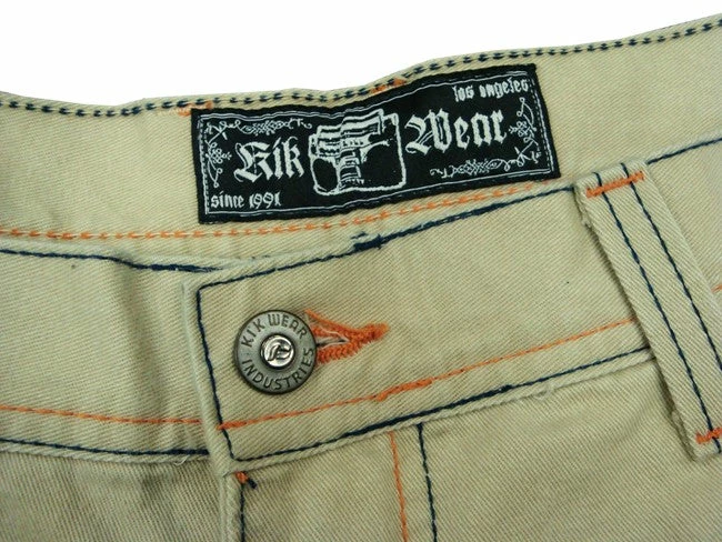 Zip up fly, embroidered K on back right pocket, double contrast stitching