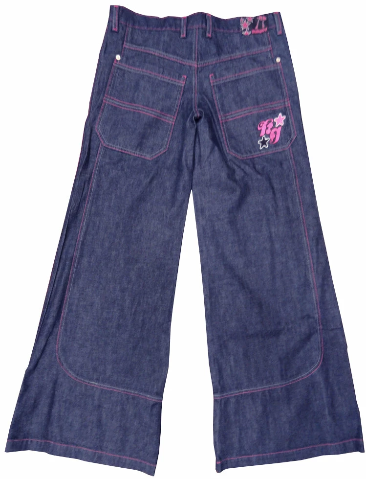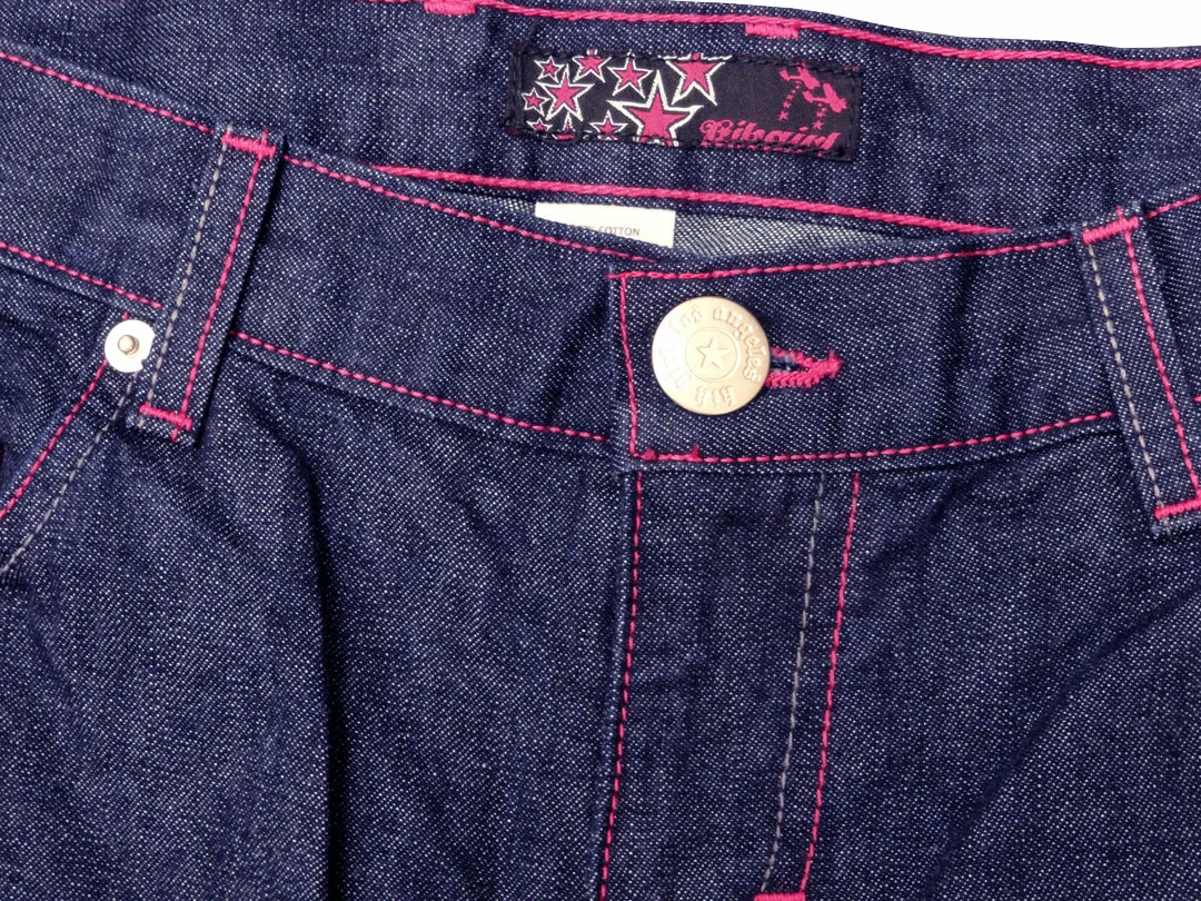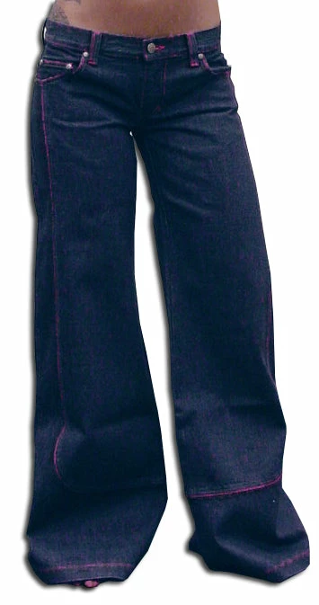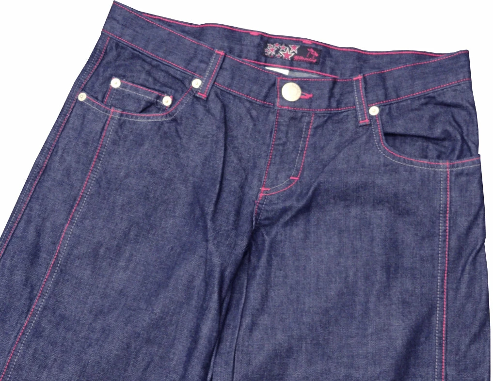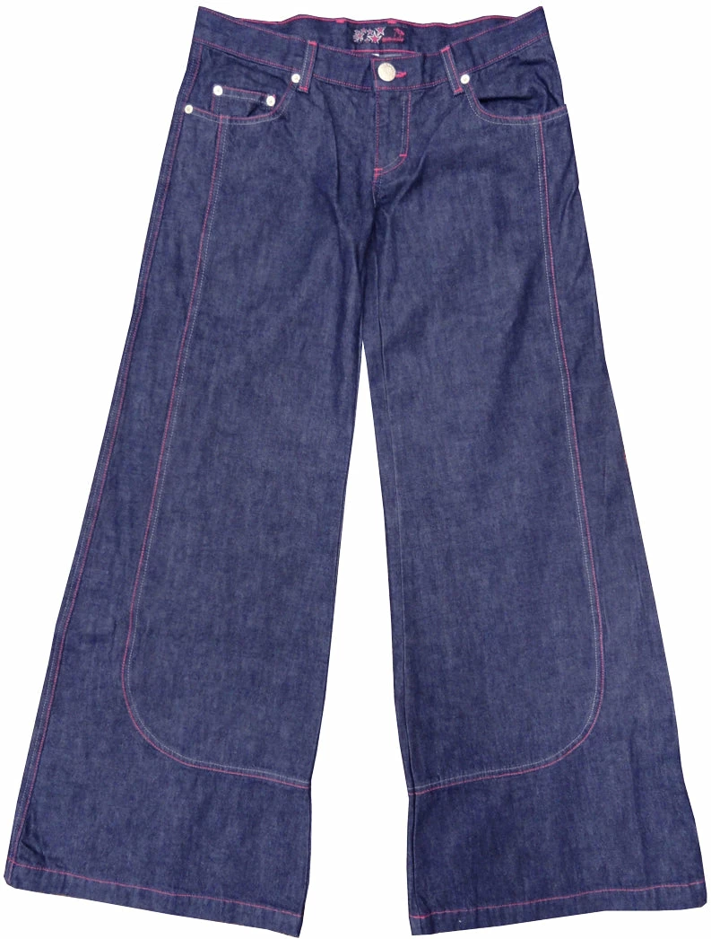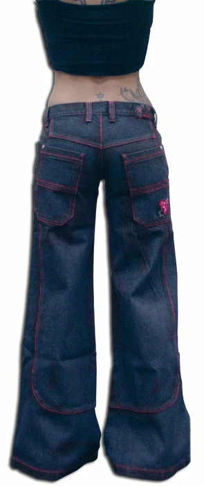 KikGirl 26″ Deluxe Wideleg Pants,Navy Denim Large Back Pockets, Stash Pkt, Embroidered KikGirl logo on Right Back Pkt,Zip Up Fly. Pink Stitching. 100% Cotton, Imported. KikGirl wideleg jeans are 100% machine washable so there’s no running to the cleaners. As with all Kik Wear clothing, a comfortable great fit every time!