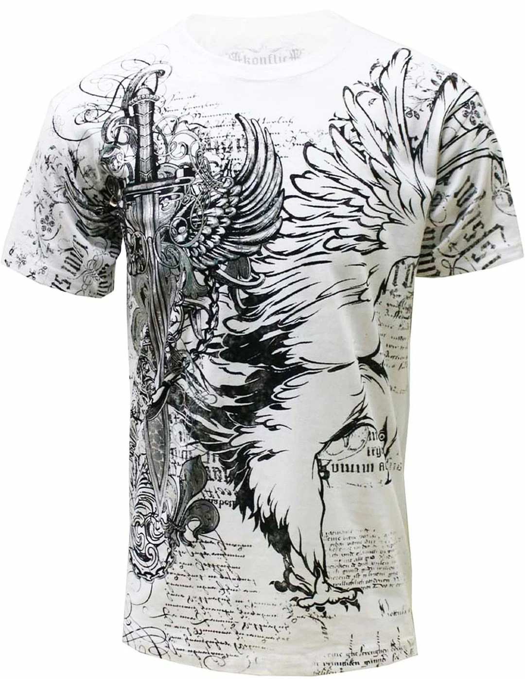 Konflict T2G “Winged Sword” T-Shirt. Enter the world of Konflict; a place where style rules and only the strong survive. Konflict T2G clothing brings you this full line of MMA inspired t-shirts the are perfect for an aggressive lifestyle. Each battle hardened t-shirt is sure to make look supreme whether you are sweatin’ it out at the gym, hittin’ the club or takin’ the streets by storm. Each Konflict T2G T-Shirt features premium 100% cotton construction, Detailed immersion ink prints all over and are accented by unique metallic ink for a bad ass look that’s all your own. Get with it and get in Konflict!