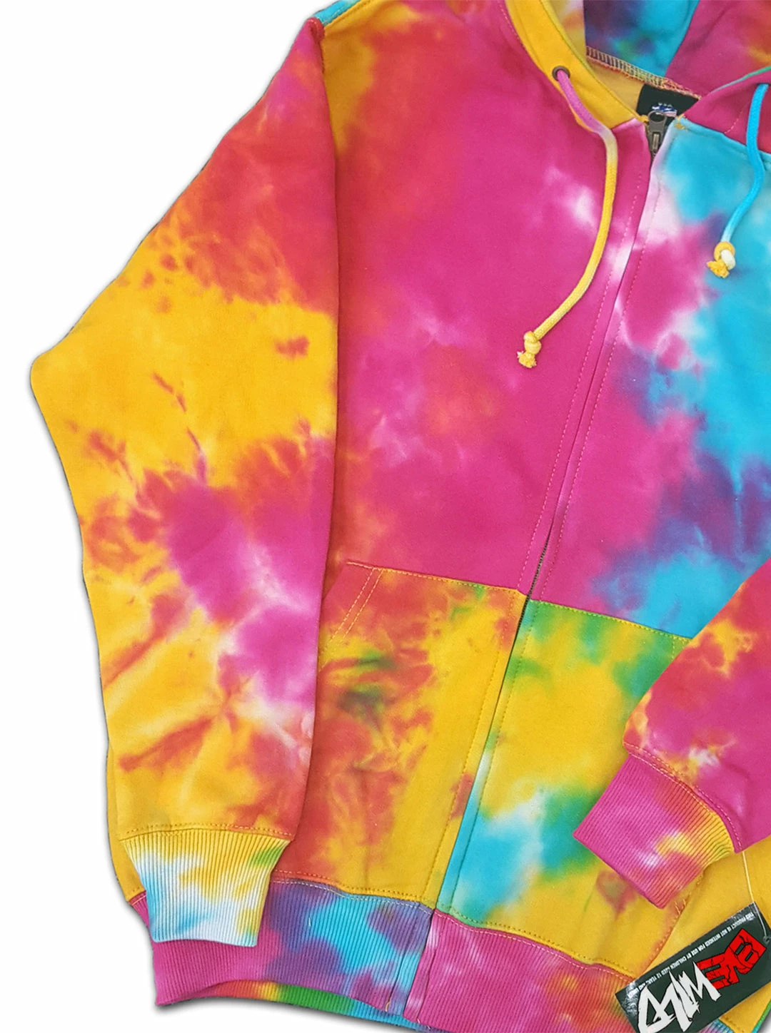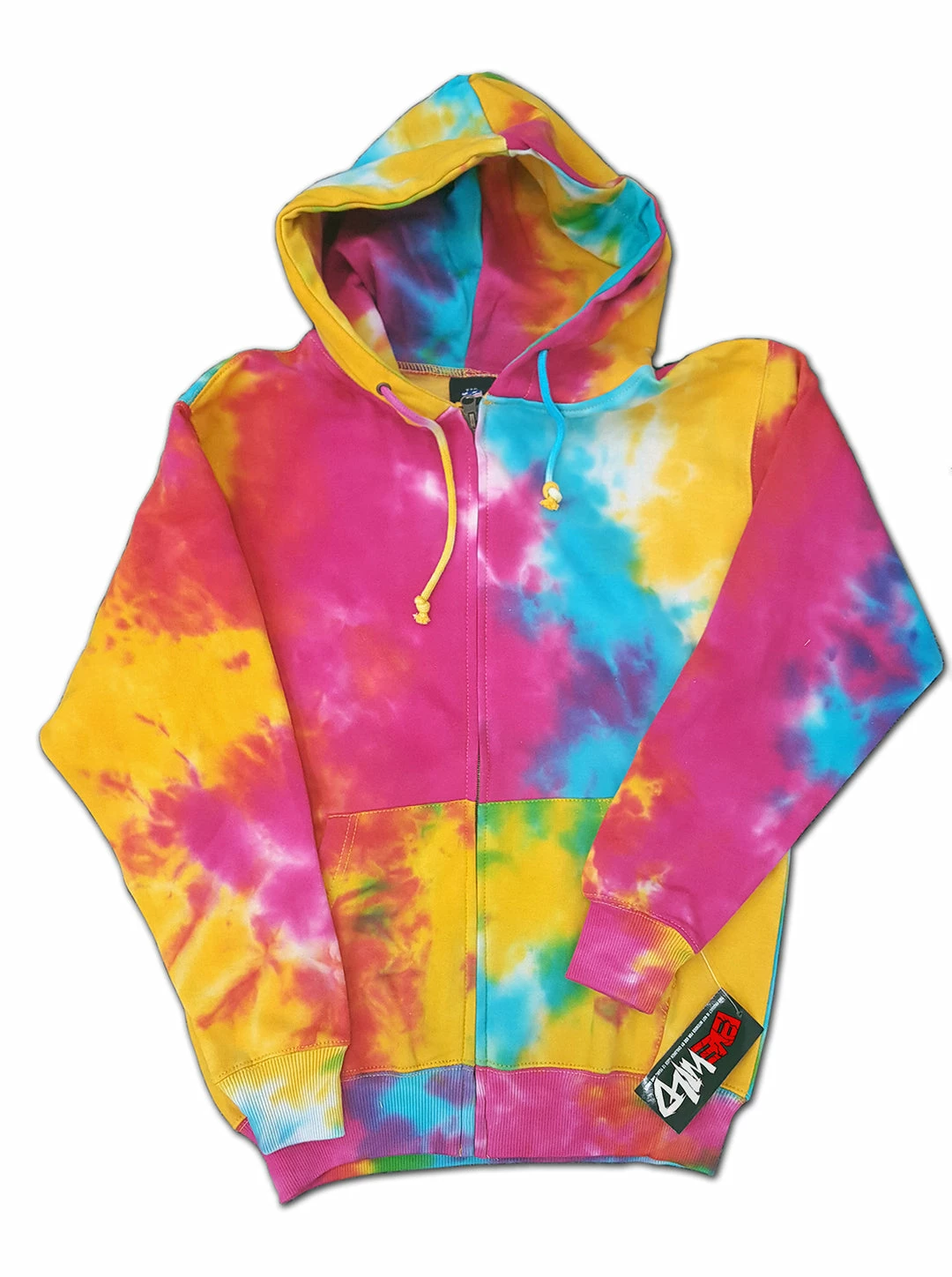 Multi Color Tie Dye Zip Up Hoodie. Tie dye have been common practice since the early 1960’s. This unique colorization process is a mystery to most but cool to all. All of Bewild’s Tyedyed clothing is individually hand made by masters of the art, most of which have been in practice since the original hippie era where tie dying gained its popularity. Dye dying is one of the most unique forms of fabric modification. Each hand made tiedie garment is one of a kind and will have countless special attributes to each individual piece. Vivid colors blended and contrasted in special patterns make BeWild’s exclusive line of tie dyed apparel the right choice if you expect the finest quality and artisan craftsmanship
