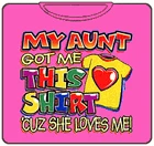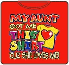 My Aunt Got This Shirt For Me Kids T-Shirt. Each shirt is screen printed with the phrase, “My Aunt Got Me This Shirt Cus’ She Loves Me” Exclusively yours from Bewild.com. Great for gifts for your childs everyday use. This Print comes in a variety of colors to be worn by both young boys or girls. Get your child one today. 100 percent cotton.