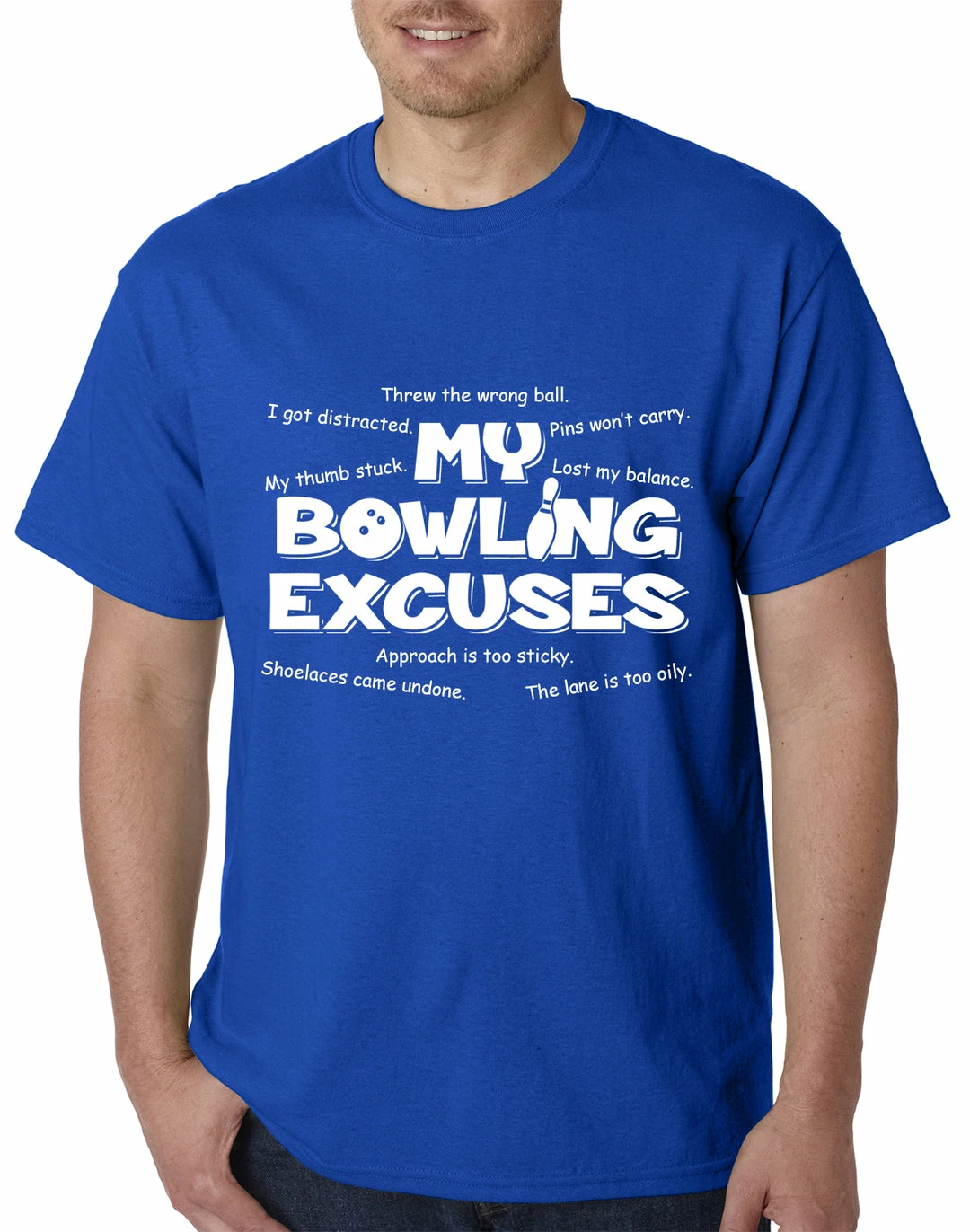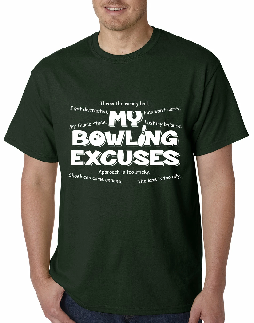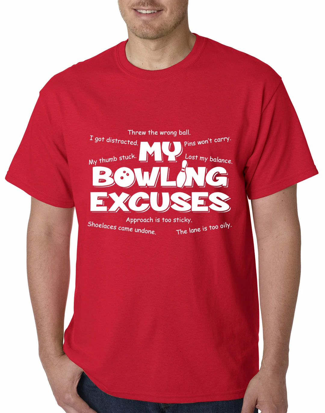 This amazing Bowling shirt is just what you need. 9 ready to go, completely beliveable excuses. We thought about putting a 10th excuse on here, one for every frame, but if you need all 9, you probably shouldn’t be playing this game anyway.