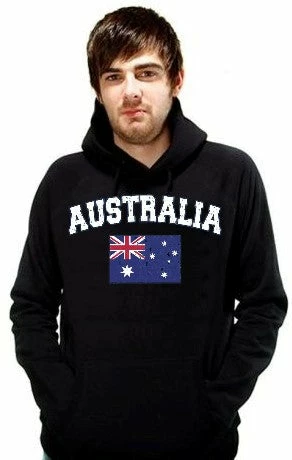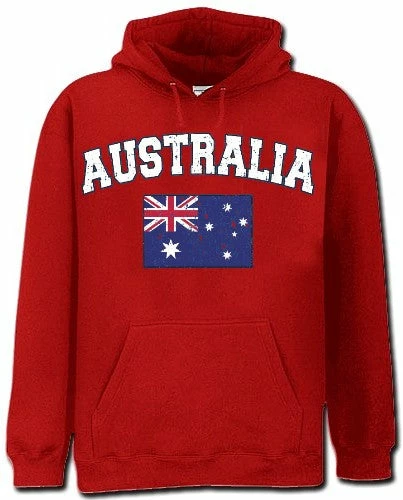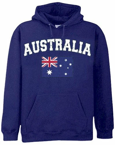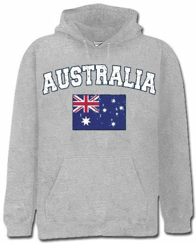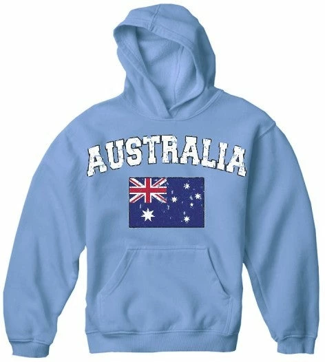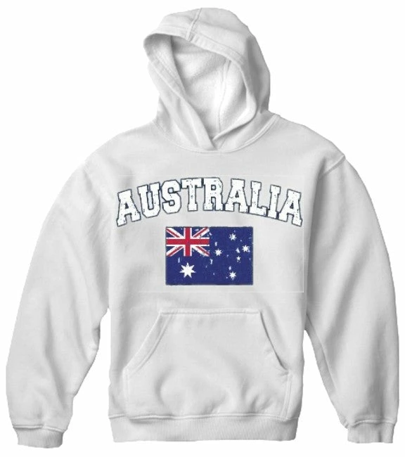 Australia Vintage Flag International Hoodie. Show pride for your favorite Nation! Our collection of deluxe vintage international print Hoodies are the perfect way to support your home country. Each shirt features premium vintage style designs made to look distressed for that soft “Favorite Old Sweatshirt” look from day one. These shirts are perfect whether you are rooting for your favorite soccer nation or just showing your love for a special country. Bold athletic style writing spells out each country’s name curved above the country’s national shield; a classic design that is sure to display your patriotism! Each shirt is printed to order on a deluxe hooded sweatshirt in your choice of color.