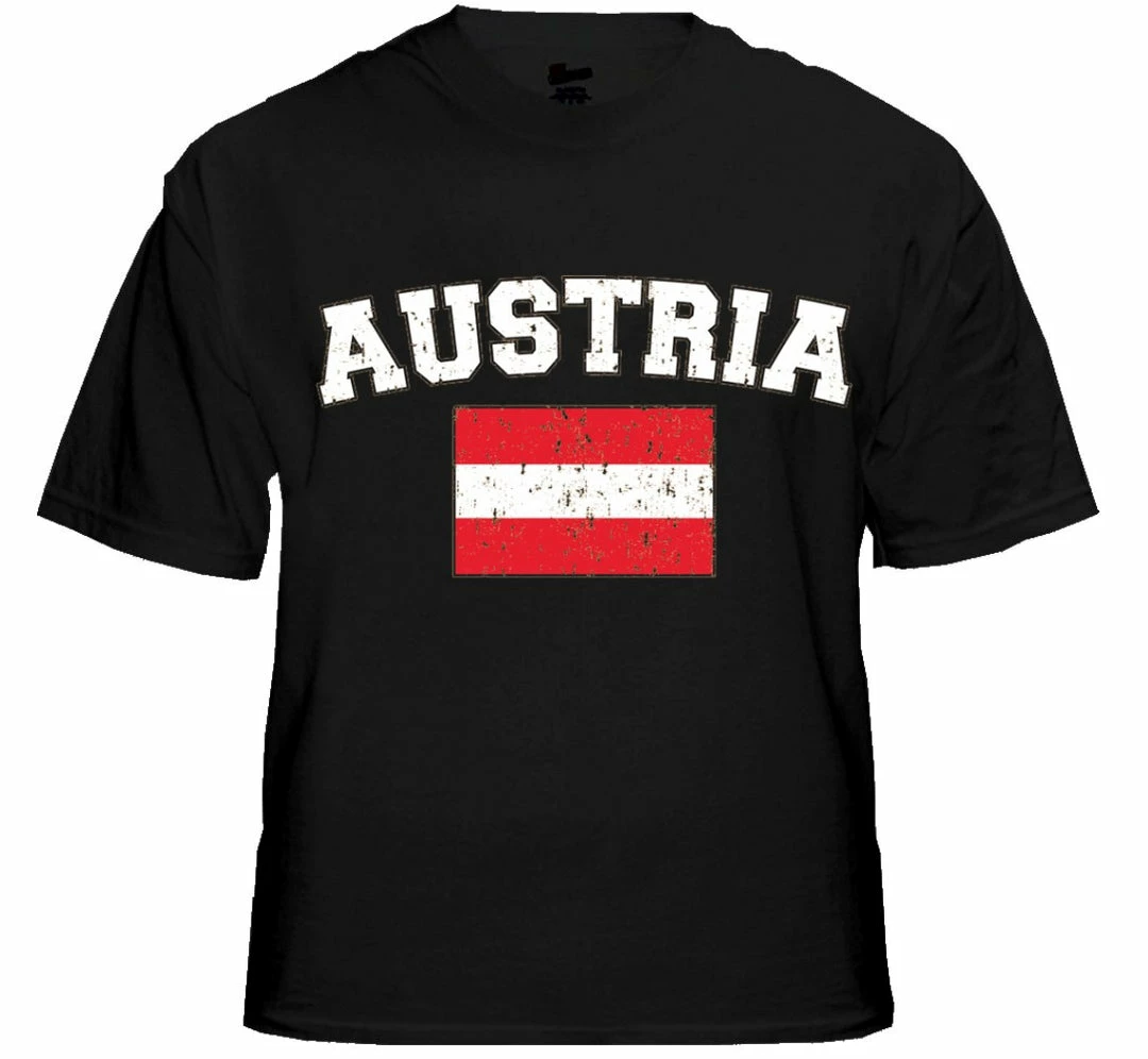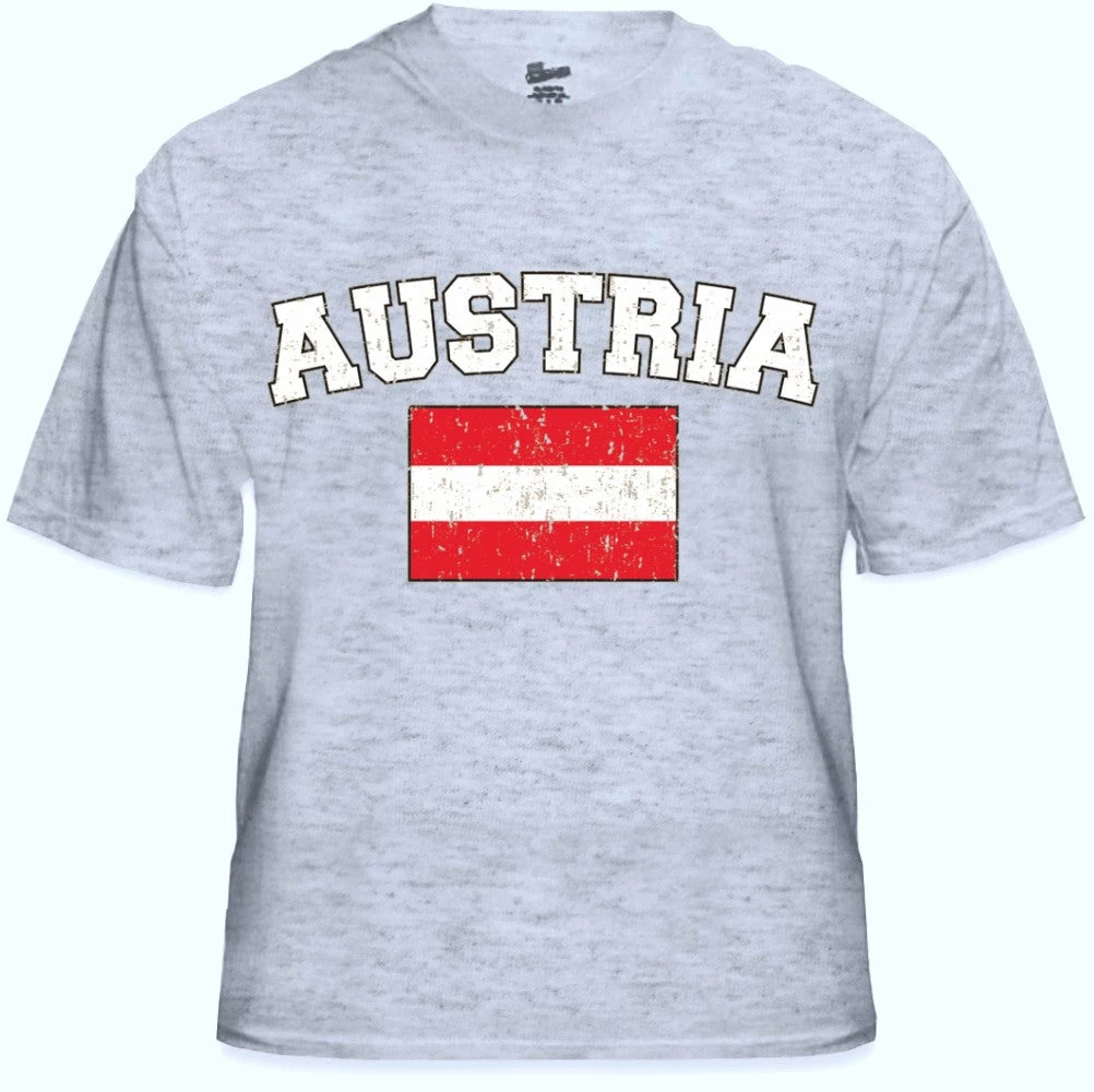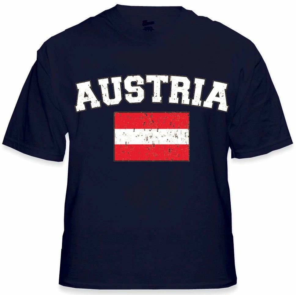 Austria Vintage Flag International Mens T-Shirt. Show pride for your favorite Nation! Our collection of deluxe vintage international print t-shirts are the perfect way to support your home country. Each shirt features premium vintage style designs made to look distressed for that soft “Favorite Old T-shirt” look from day one. These shirts are perfect whether you are rooting for your favorite soccer nation or just showing your love for a special country. Bold athletic style writing spells out each country’s name curved above the country’s national shield; a classic design that is sure to display your patriotism! Each shirt is printed to order on a deluxe Cotton tee shirt in your choice of color.