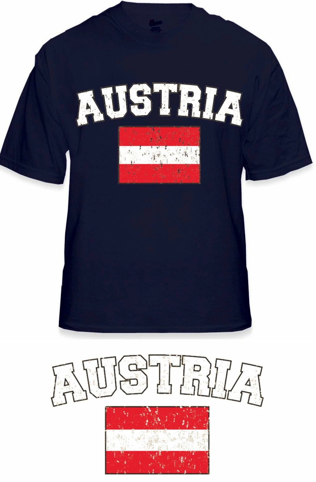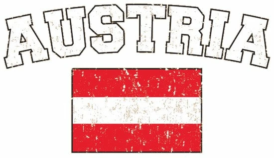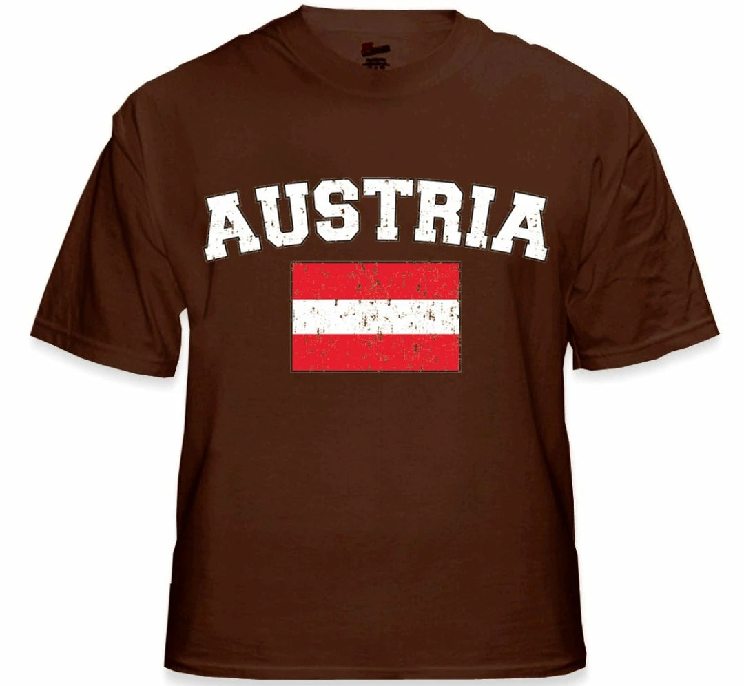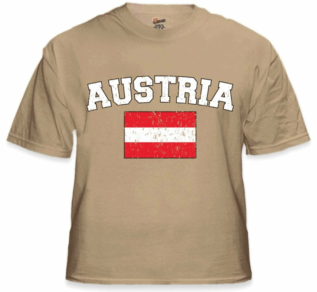 Austria Vintage Flag International Mens T-Shirt. Show pride for your favorite Nation! Our collection of deluxe vintage international print t-shirts are the perfect way to support your home country. Each shirt features premium vintage style designs made to look distressed for that soft “Favorite Old T-shirt” look from day one. These shirts are perfect whether you are rooting for your favorite soccer nation or just showing your love for a special country. Bold athletic style writing spells out each country’s name curved above the country’s national shield; a classic design that is sure to display your patriotism! Each shirt is printed to order on a deluxe Cotton tee shirt in your choice of color.