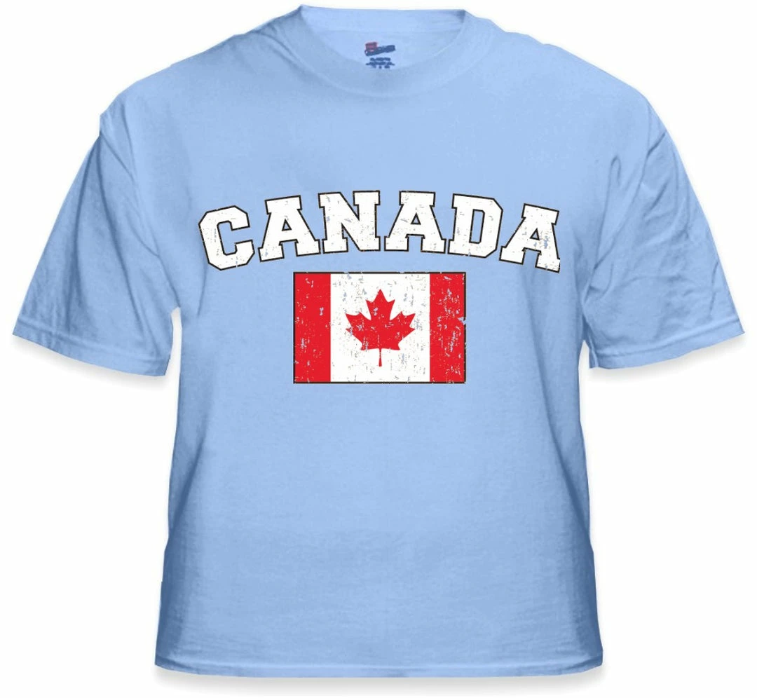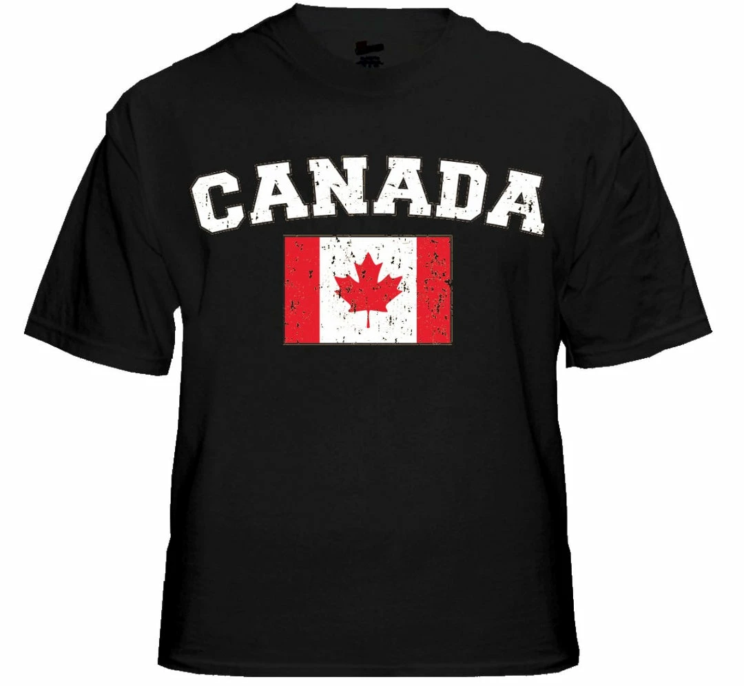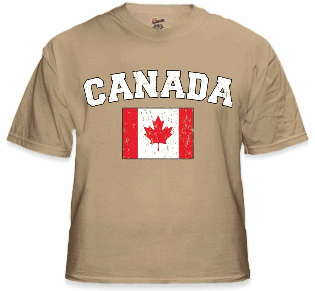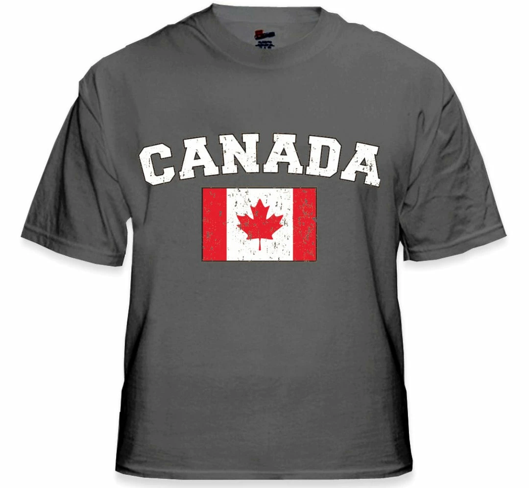 Canada Vintage Flag International Mens T-Shirt. Show pride for your favorite Nation! Our collection of deluxe vintage international print t-shirts are the perfect way to support your home country. Each shirt features premium vintage style designs made to look distressed for that soft “Favorite Old T-shirt” look from day one. These shirts are perfect whether you are rooting for your favorite soccer nation or just showing your love for a special country. Bold athletic style writing spells out each country’s name curved above the country’s national shield; a classic design that is sure to display your patriotism! Each shirt is printed to order on a deluxe Cotton tee shirt in your choice of color.