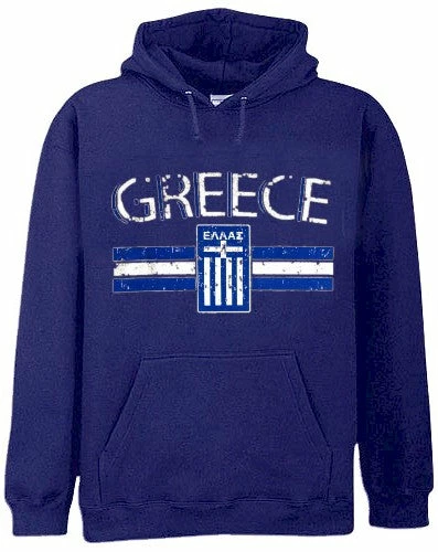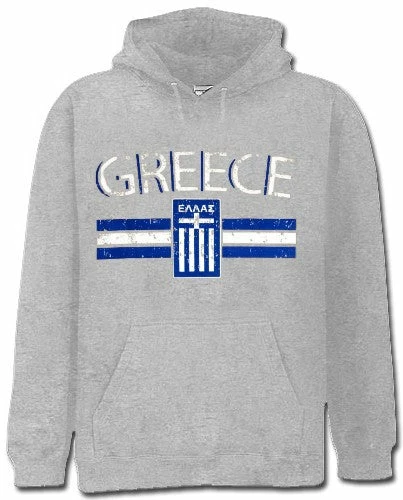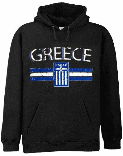 Greece Vintage Shield International Hoodie. Show pride for your favorite Nation! Our collection of deluxe vintage international print Hoodies are the perfect way to support your home country. Each shirt features premium vintage style designs made to look distressed for that soft “Favorite Old Sweatshirt” look from day one. These shirts are perfect whether you are rooting for your favorite soccer nation or just showing your love for a special country. Bold athletic style writing spells out each country’s name curved above the country’s national shield; a classic design that is sure to display your patriotism! Each shirt is printed to order on a deluxe hooded sweatshirt in your choice of color.
