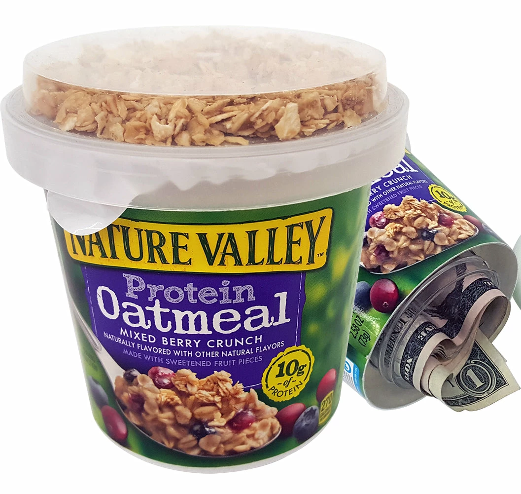Diversion Can Safes. With our Diversion safe cans you can protect your valuables and keep them in plain sight with out fearing theft or detection. Diversion safes work on a very simple concept, hide your possessions where nobody would think to look. Each Diversion safe is made of an authentic brand name container so the safe appears to be just that normal product. The can safes are then filled and weighed to feel full and unopened. Nobody would ever suspect your unopened cup of oatmeal is actually holding your most prized possessions. Storage compartment measures 3 1/4 inches deep by 2 inches in diameter.
