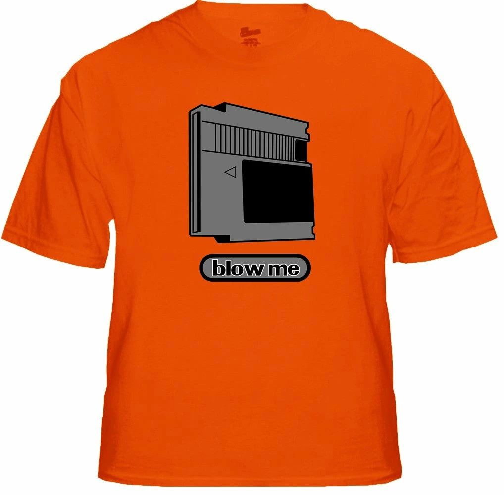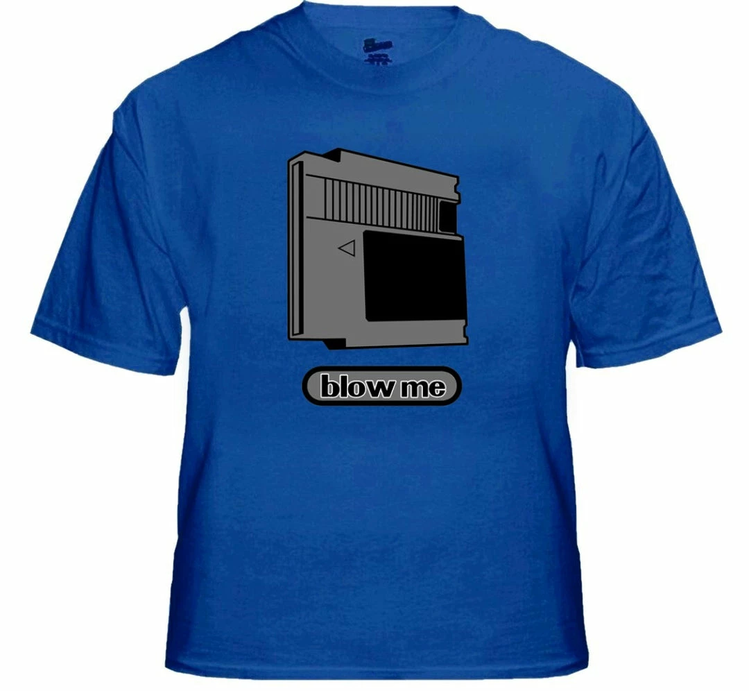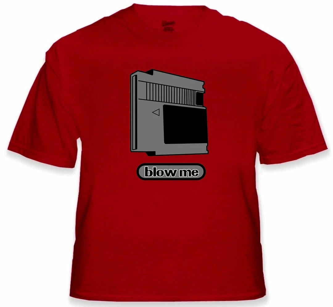 NES Nintendo Cartridge Blow Me T-Shirt. Overdose Clothing, offering the tightest line of rude and offensive novelty tees brings you this awesome addition. Premium prints on super comfortable 100% Cotton tees. Get your point across with one of these loud Novelty tees. You will get laughs and compliments on your new shirt!