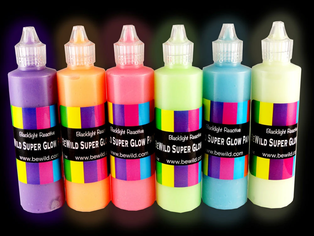 Each tube of Glow Paint is non-toxic, non-flammable, and can be clear-coated after dry. Completely safe for all surfaces including your skin, body or even your face! These tubes contain waterborne acrylic paint that when applied to fabric must dry for 72 hours before washing. If you desire to clear coat after application you may do so after 12 hours dry time. Can be used on fabric, plastic, metal, glass and wood. This kit comes complete with all 6 colors, green, blue, pink, purple, orange & Natural clear. Each tube has 2oz of Paint.