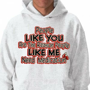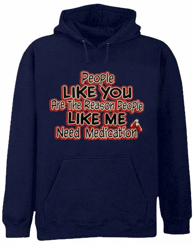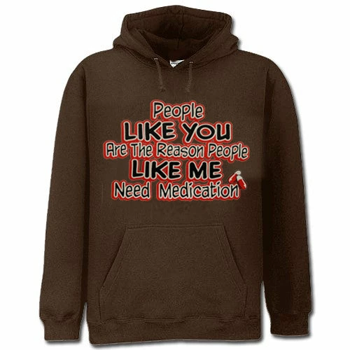 People Like You Are The Reason Why People Like Me Need Medication Hoodie. The largest selection of funny and offensive novelty hoodies are here! Our novelty hoodies are funny and to the point and designed to look great and get the point across. Wear our selection of humorous joke hoodies to a house party, school, the club or even just around the house. Each design has been hand selected by our team of humorist so you are sure to get all the laughs at your next event! Each design is printed on a comfy deluxe 100% cotton hoodie in your choice of color.