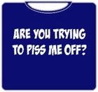 Piss Me Off T-Shirt. Exclusively from Bewild.com, these new tee’s feature hard-core sayings that say it all. From “Trust Me I’m A Doctor” to “Thats Mr. Asshole To You”. How about a t-shirt that says “I Scored High On My Drug Test” Our short sleeve t-shirts are made from a 100% fully machine washable cotton/poly blend for a cool and comfortable fit every time. On the front of this shirt it says “Are you trying to piss me off?”
