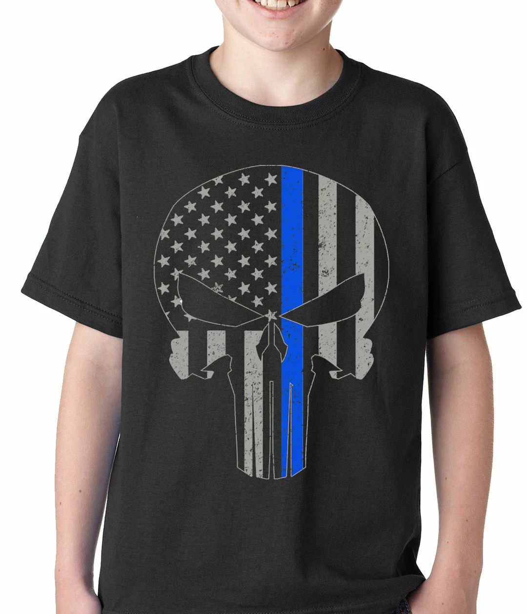 Bewild Police Thin Blue Line Skull American Flag – Support Police Department Kids T-shirt Say It Loud