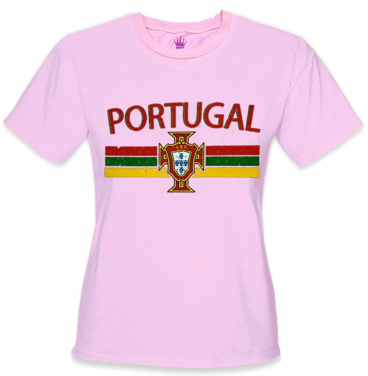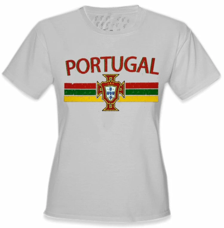 Portugal Vintage Shield International Girls T-Shirt. Show pride for your favorite Nation! Our collection of deluxe vintage international print t-shirts are the perfect way to support your home country. Each shirt features premium vintage style designs made to look distressed for that soft “Favorite Old T-shirt” look from day one. These shirts are perfect whether you are rooting for your favorite soccer nation or just showing your love for a special country. Bold athletic style writing spells out each country’s name curved above the country’s national shield; a classic design that is sure to display your patriotism! Each shirt is printed to order on a deluxe Cotton tee shirt in your choice of color.