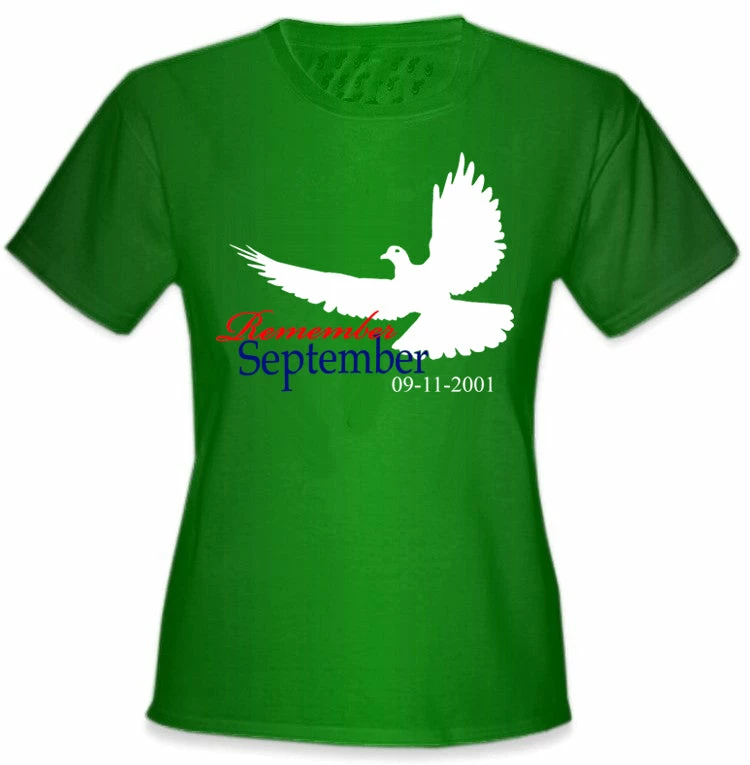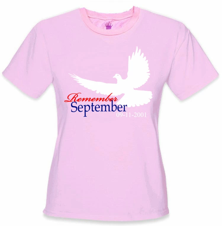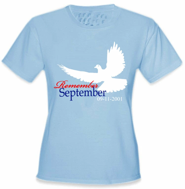 Remember September 9/11 Girl’s Tee. Show your support for the US with this Remember September 9/11 t-shirt! Featuring a beautiful bird and it says “Remember September” in red and navy blue. 9/11 was a devastating blow to the US and it should never be forgotten. All the amazing people that helped the cause and died for our country will never be forgotten!