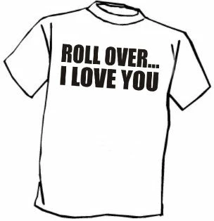 Now say it with a Statement T-Shirt. Exclusively from Bewild.com, these new tee’s feature hard-core sayings that say it all. From “Vaginacologist” to “Skanky white-trailer trash”. How about a t-shirt that says “Dip me in Chocolate and throw me to the lesbians?” Our short sleeve t-shirts are made from a 100% fully machine washable cotton/poly blend for a cool and comfortable fit every time. On the front of this shirt it says Roll Over I Love You.