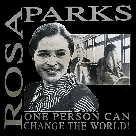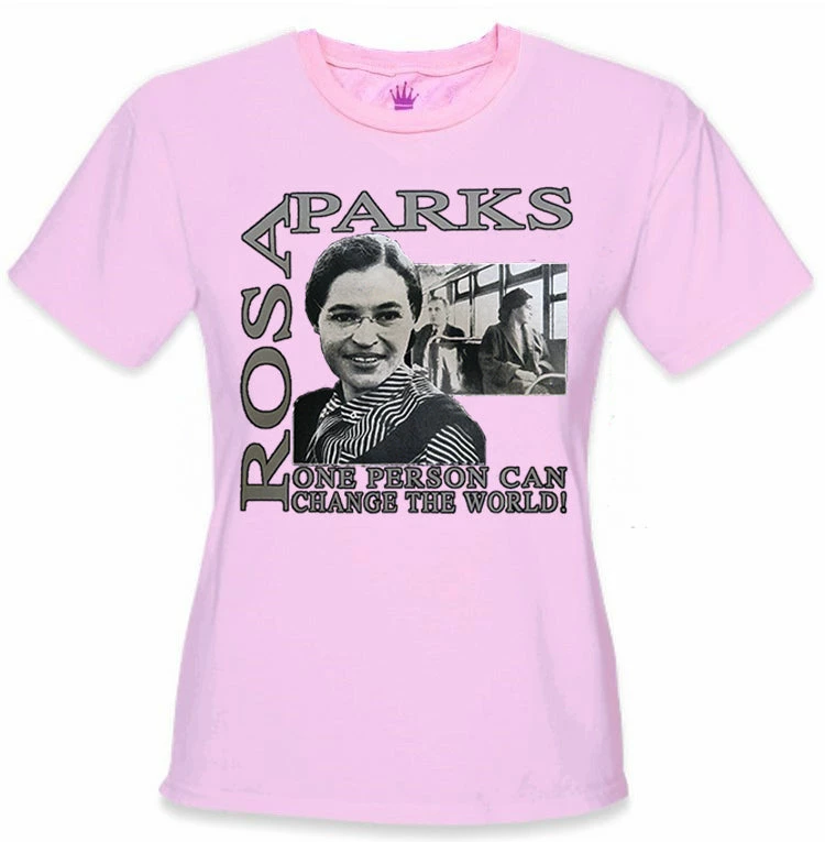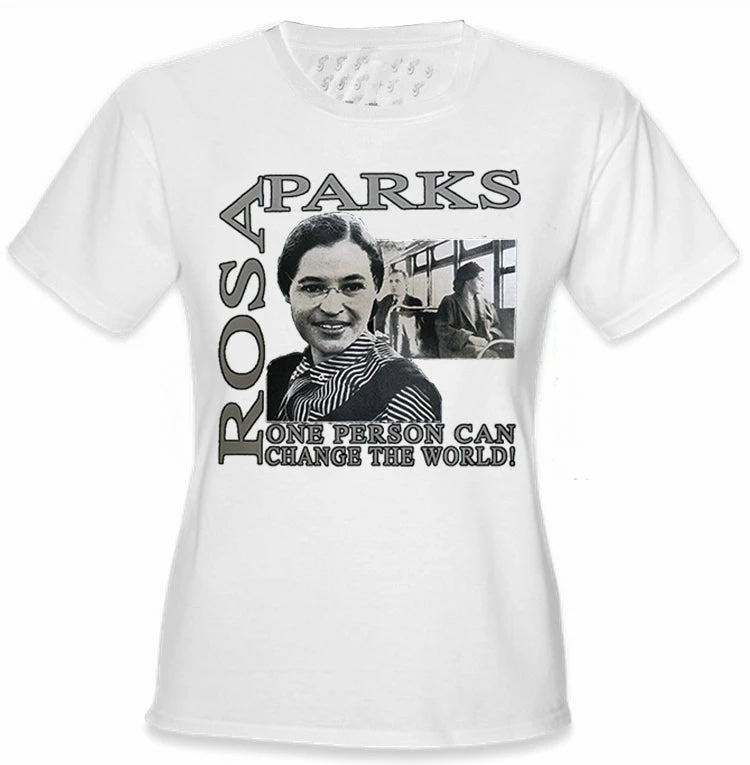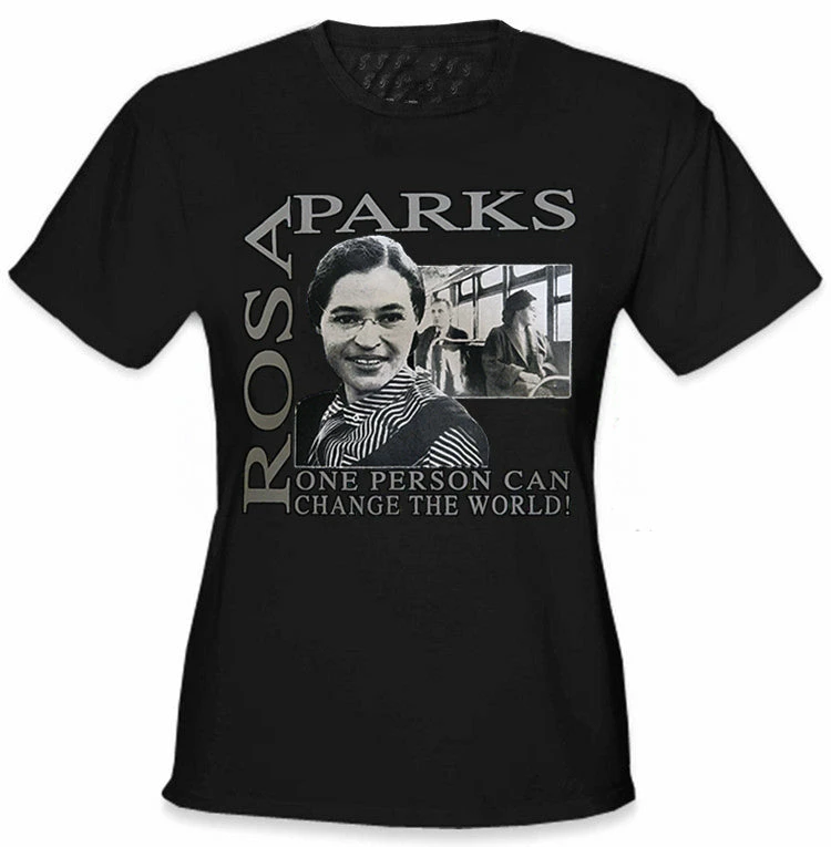 Rosa Parks “Change The World” Girl’s T-Shirt. This powerful commemorative t-shirt remembers the actions of Rosa Parks who sat so all african Americans could stand and be equal. This shirt has a photographic image of Rosa Parks and also has a representation of Rosa sitting on the bus (in front of a white man) on the day that forever changes history.