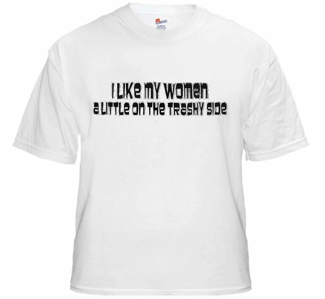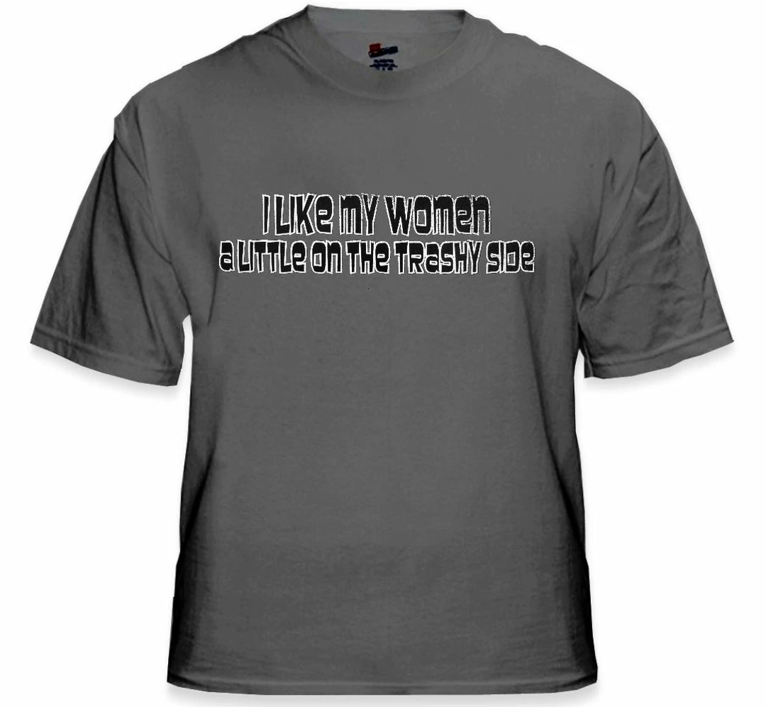 Rude & Offensive Novelty Tees – “A Little On The Trashy Side” T-Shirt. There is something hot about trashy girls, No guy likes to admit to it but deep down there is something about a girl in ripped up jeans with her butt check showing! We have all seen them at bars wearing too much make up with their shirt strategically placed some where directly under their breasts. Men pretend not to notice in fear of ridicule but trust me… They notice! Bring home a little trashy tee today and be proud!