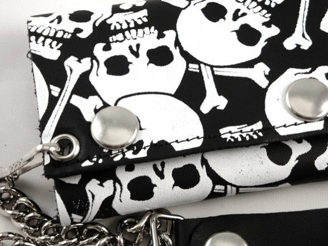 Skulls All Over Genuine Leather Chain Wallet. Our Genuine Leather Chain Wallets Are made with you in mind, with all the compartments you need for all your valuables, money, credit cards ID cards and photos all in one great looking secure place. Made of 100% real leather these wallets are beefy and tough and of course look great! This Wallet comes complete with a removable 17” chrome chain that easily clips to a sturdy corner rivet on the wallet. This wallet can be used with the chain or without. To attach this chain wallet to you pants simply snap the leather button hoop to the front belt loop of your pants. This wallet is a great fashion statement but also secures your wallet and belongings safely to you making theft or loss of your wallet nearly impossible. the chain also features a loose clip that is perfect for attaching your keys keeping them safe and secure as well. The wallet itself features 4 separate compartments including 2 for your credit cards and IDs, one for pictures that holds 12 wallet sized photos and one over sized money compartment on the top that is big enough to hold any kind of international currency.